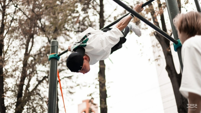 Антон, участник площадки воркаута – атлет, приехавший из Москвы по приглашению своих друзей. Он занимается воркаутом уже 3 года и не первый раз посещает фестиваль: