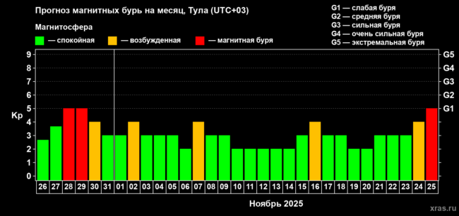 Магнитные бури уровня G1 считаются самыми слабыми, уровень G3 — сильная буря, которая вызывает перебои в спутниковой навигации и радиосвязи.