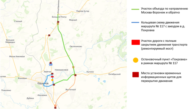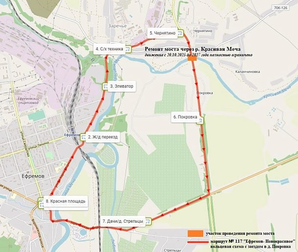 Особое внимание уделено логистике для жителей деревни Покровки, чья транспортная доступность окажется под влиянием ограничений. Их обслуживание будет организовано с остановочных пунктов «Элеватор» в городе Ефремове и «Чернятино». Для обеспечения доступа к последнему запланировано строительство пешеходного моста через реку Красивая Меча.