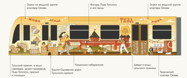 22 октября на Арбатско-Покровскую линию вышел брендированный поезд проекта «Открой Тульскую область», дизайн для которого разработала дизайнер студии «МИРА» Полина Ильяш. В течение ближайших шести месяцев москвичи и гости столицы будут видеть работу автора в вагонах поезда.