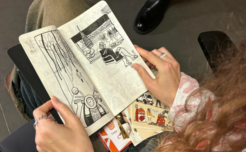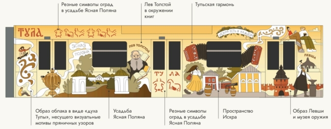 Дизайнер оформила эскиз в своем стиле, использовала юмор, раскрывающий суть города. Она изобразила все значимые места и символы родного края: Кремль, пряники, набережную, самовары, Льва Толстого и Ясную Поляну, Музей оружия и даже кластер «Октава». При этом не обошлось и без уникальных деталей: Полина нарисовала котов, скейтера, катающегося по волнам из мыслей и облаков, а также пасхалки.