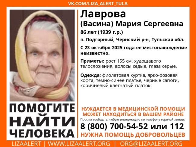 Пожилую жительницу поселка Подгорного Чернского района ищут волонтеры поискового отряда «ЛизаАлерт». 86-летняя Мария Сергеевна Лаврова (Васина) пропала в прошлый четверг, 23 октября. Пенсионерка нуждается в медицинской помощи.