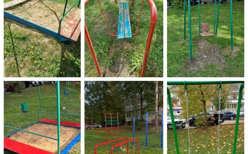 На качелях использовались жесткие элементы подвеса, в песочнице росла трава, а игровое оборудование требовало покраски. На информационном стенде не было правил пользования и контактов службы эксплуатации.