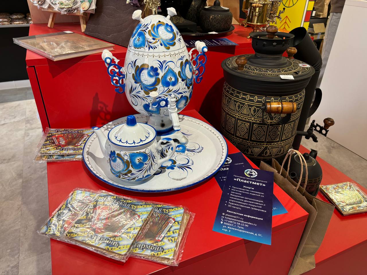В фирменном магазине можно познакомиться с товарами тульских мастеров, например, из керамики. Елена Палевская – народный мастер, директор частного учреждения культуры «Центр традиционной тульской керамики» рассказала, что в искусстве она давно. За свою жизнь она набралась большого опыта и подошла к своей работе с разных сторон: и преподавательской, и научной, и производственной. Главным результатом стало то, что керамика возвращает свои позиции тульского бренда. Когда-то производство было историческим и даже превышало масштабы по производству оружия. Сегодня созданы все условия для того, чтобы