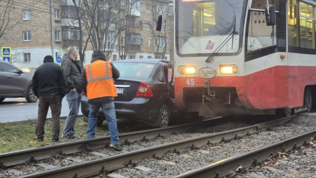 Как Ford Focus оказался на трамвайных путях — пока не уточняется. На месте работают сотрудники ГИБДД.