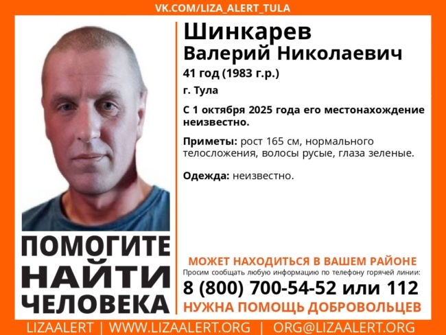 В Тульской области ищут 41-летнего Валерия Николаевича Шинкарева, о судьбе которого ничего не известно с 1 октября 2025 года. Об этом сообщили волонтеры поисково-спасательного отряда «ЛизаАлерт».