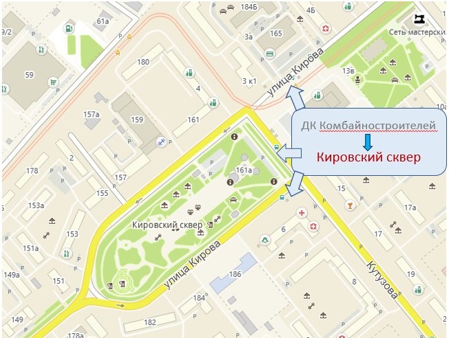 - остановка «ДК Комбайностроителей» на улице Кирова — «Кировский сквер»;
