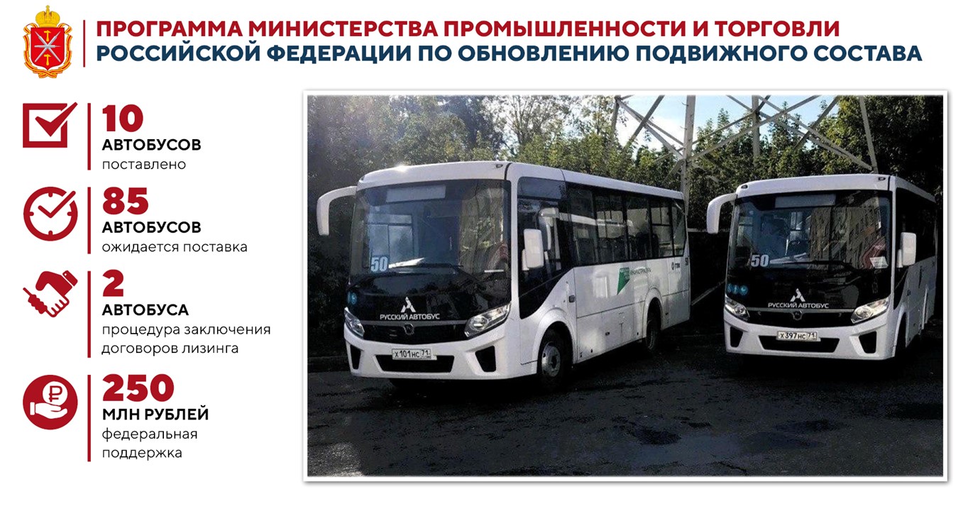 Затронула министр в своем докладе и вопрос обновления подвижного состава. Так, в Тульской области до конца этого года обновят 97 автобусов. Десять новых автобусов уже поставили. Они выйдут на маршруты оружейной столицы.