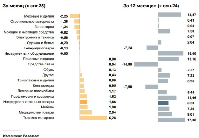 В сентябре выросли цены на продовольственные продукты. За год они подорожали сильнее, чем вся потребительская корзина в целом. Однако цены на услуги за месяц практически не изменились. Непродовольственные товары в сентябре значительно подорожали, при этом годовой рост цен оказался ниже годовой инфляции в Тульской области.