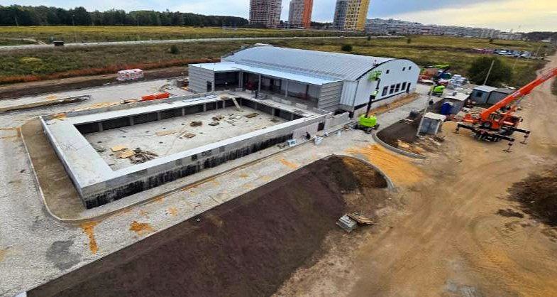 В качестве подрядчика выбрана организация ООО «Символ». На площадке работает шесть единиц техники. Сейчас уже обустроено бетонное основание здания и самого бассейна, плиты под котельную, завершен монтаж металлических конструкций каркаса здания, прокладка наружных сетей водоснабжения, водоотведения, теплоснабжения и электрический кабель.