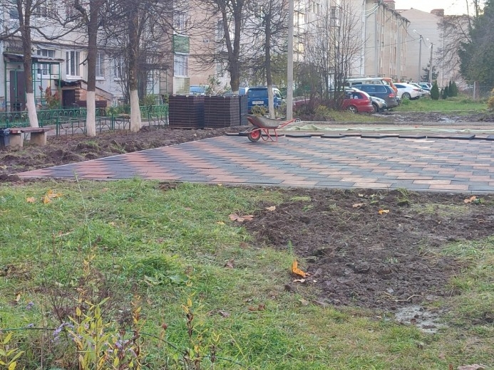 Сейчас идет укладка покрытия детской площадки. Затем будут установлены игровые элементы.