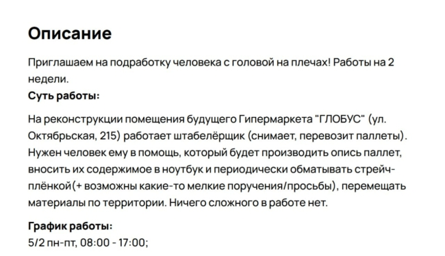 Однако на данный момент на сайте бесплатных объявлений размещена вакансия разнорабочего-грузчика для реконструкции помещения будущего гипермаркета. В описании указаны такие задачи, как опись палет, внесение данных в ноутбук, обмотка стрейч-пленкой, перемещение материалов и мелкие поручения. Цель работы также прописана: реконструкция помещения будущего гипермаркета «Глобус».