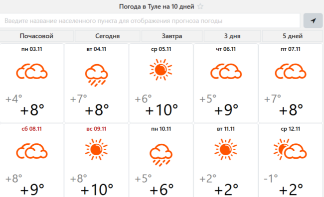 В Тульской области же эта неделя будет теплой и с переменной облачностью. Небольшой дождь ожидается только завтра, в День народного единства.