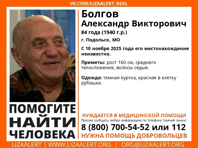 Поисковый отряд «ЛизаАлерт» разыскивает в Тульской области 84-летнего Александра Бологова. Мужчина 1940 года рождения пропал 10 ноября 2025 года, его местонахождение неизвестно.