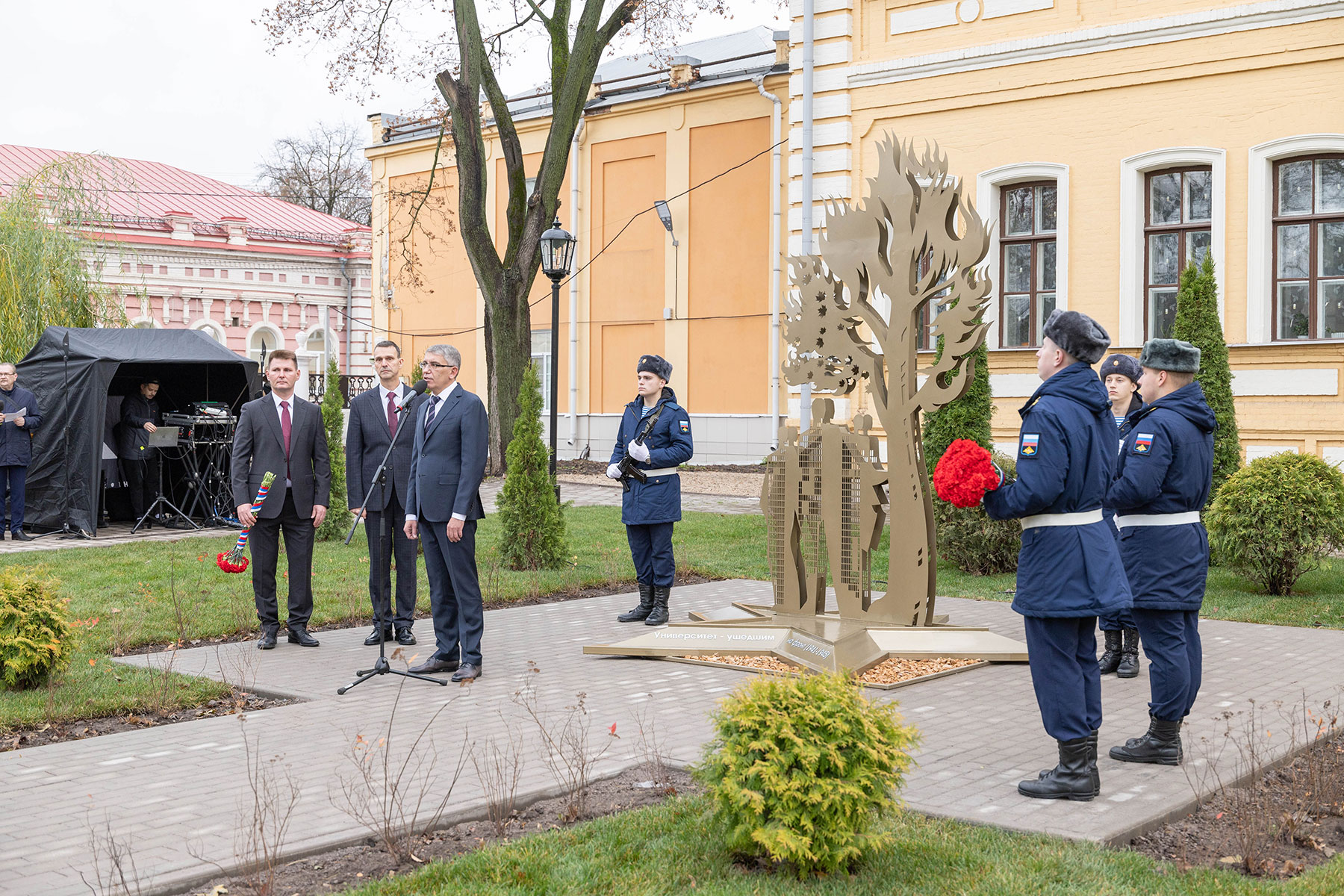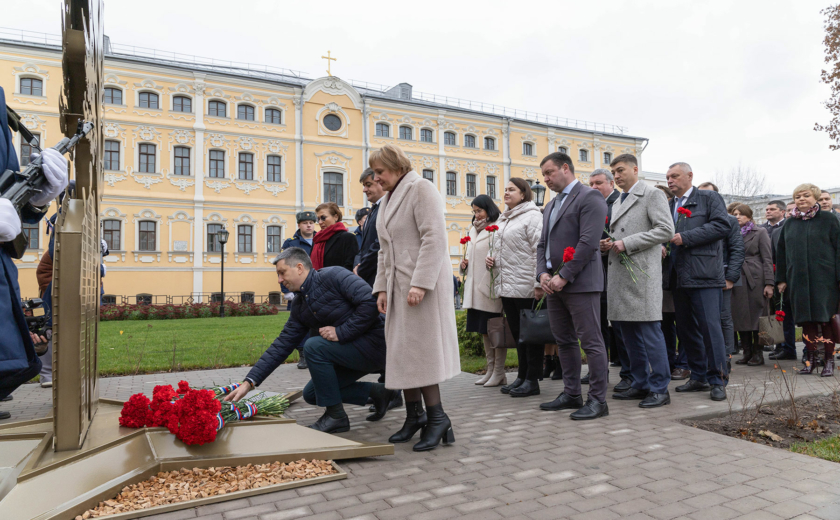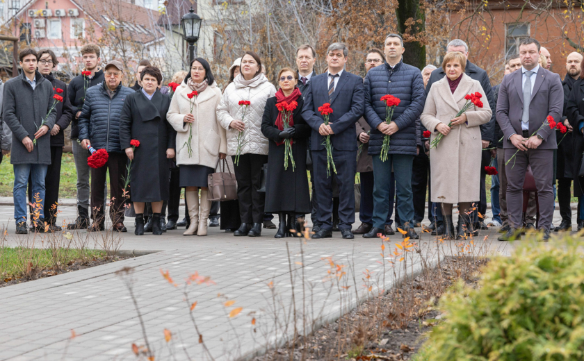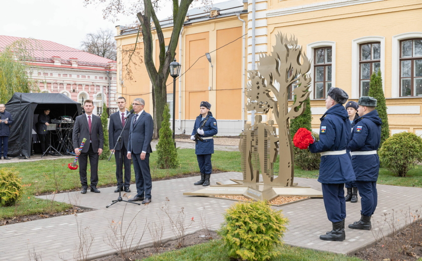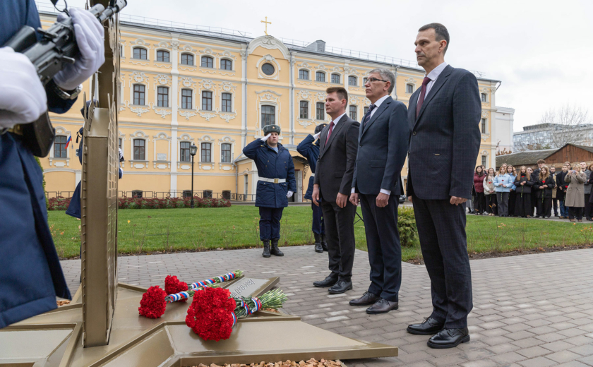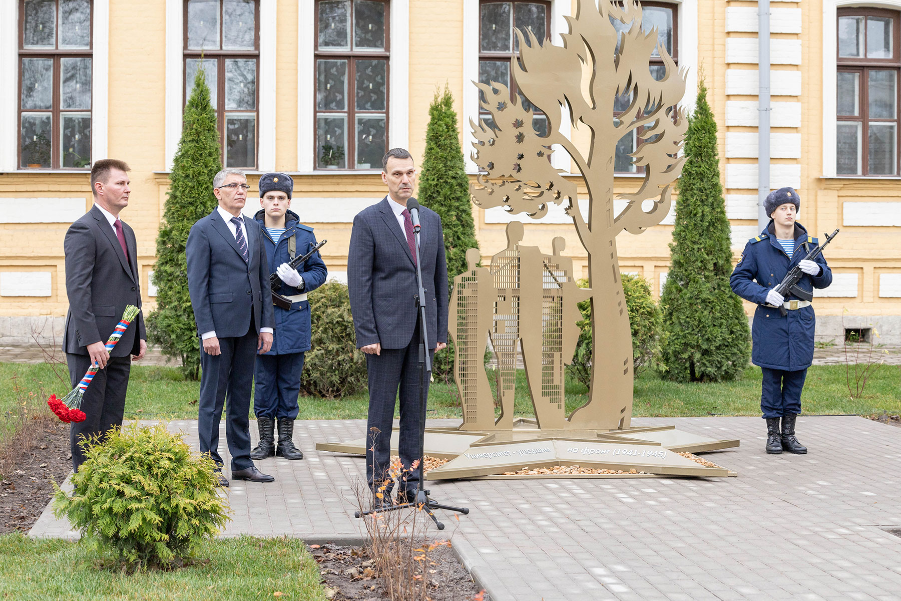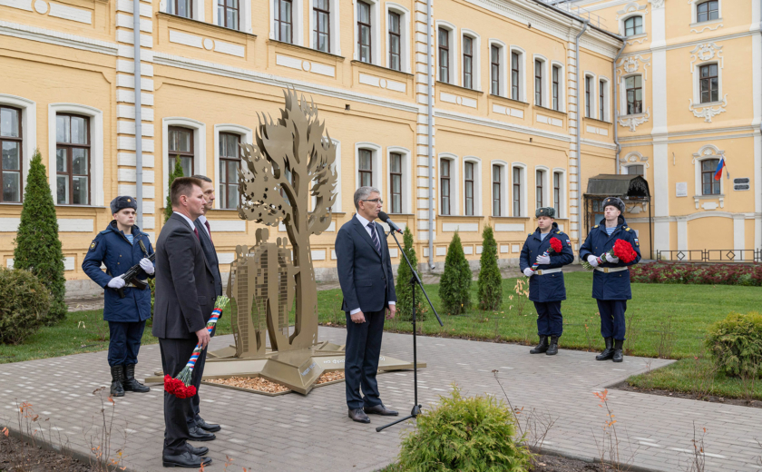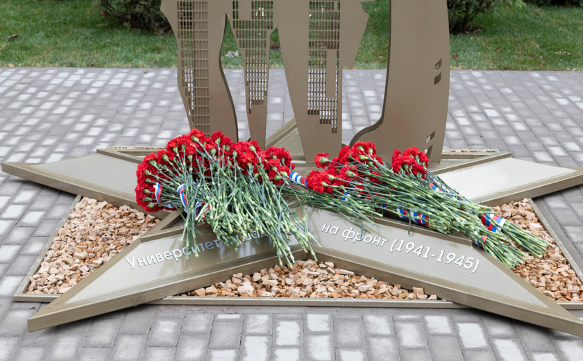 Особенность мемориала — клены, посаженные студентами и преподавателями перед уходом на фронт. Губернатор возложил цветы к памятнику вместе со внуком одного из студентов-фронтовиков Сергеем Данилиным.