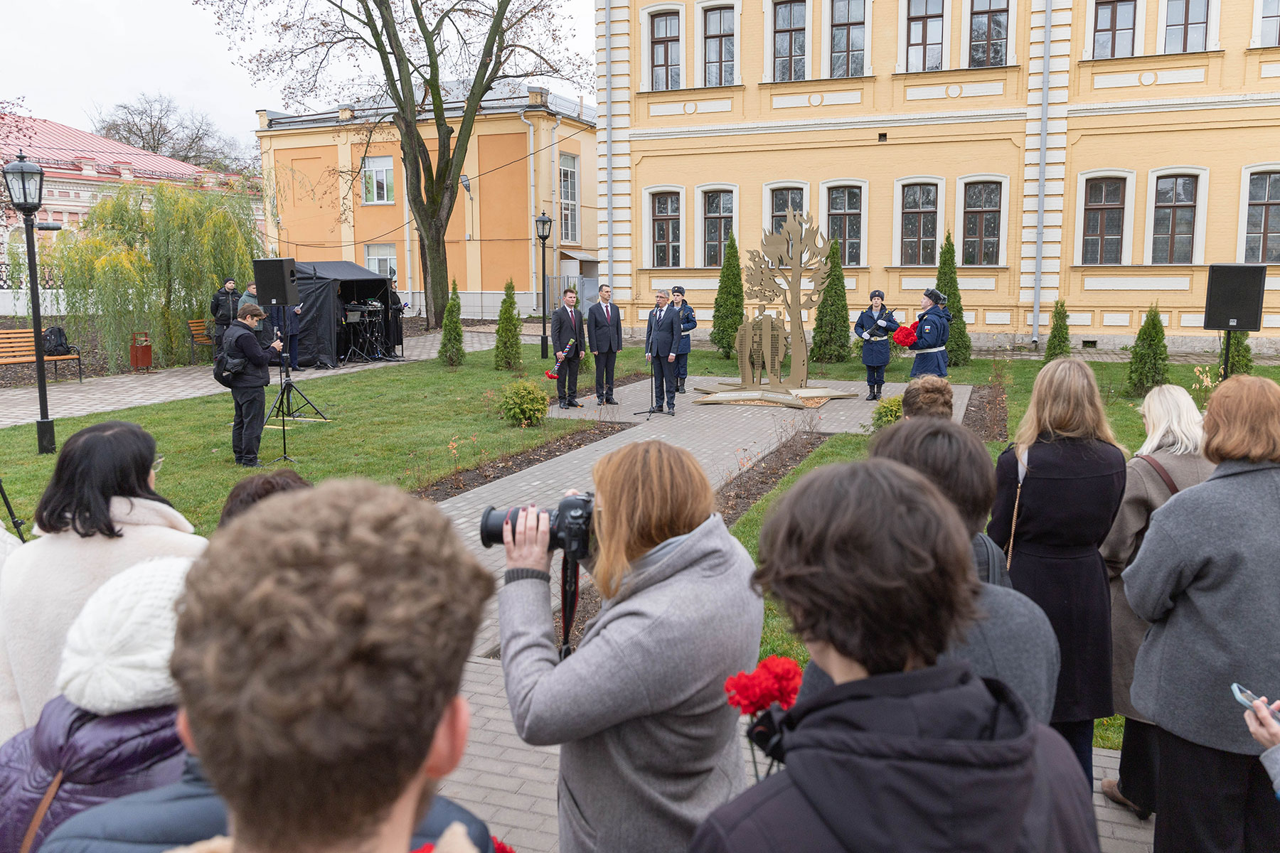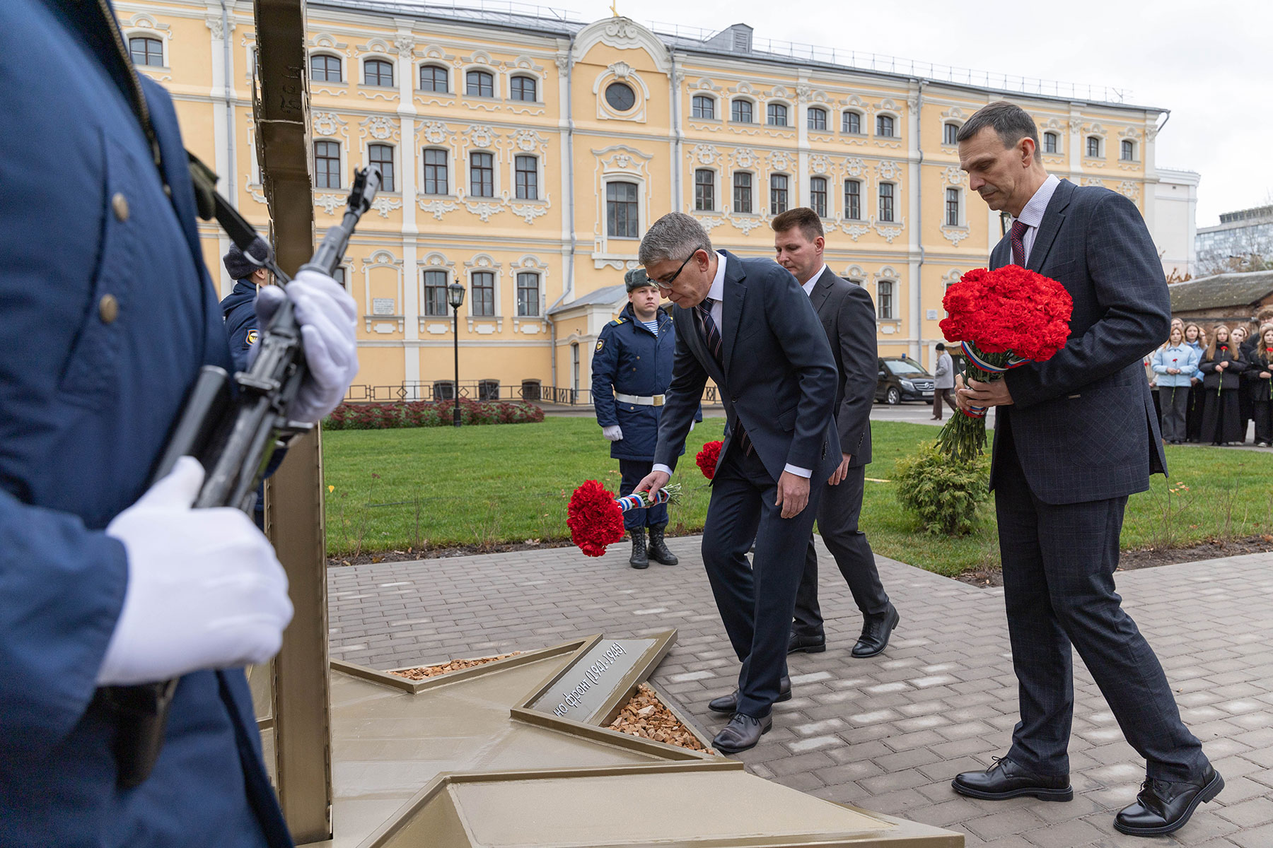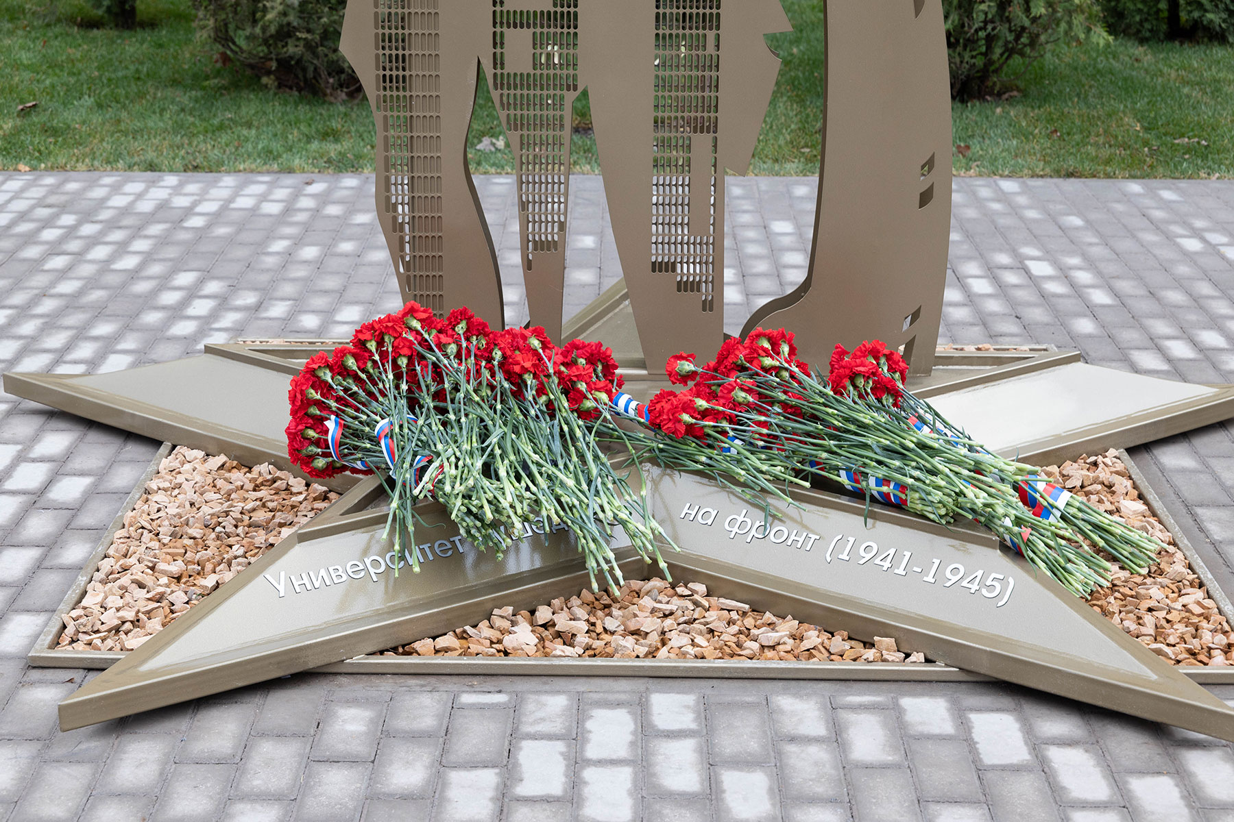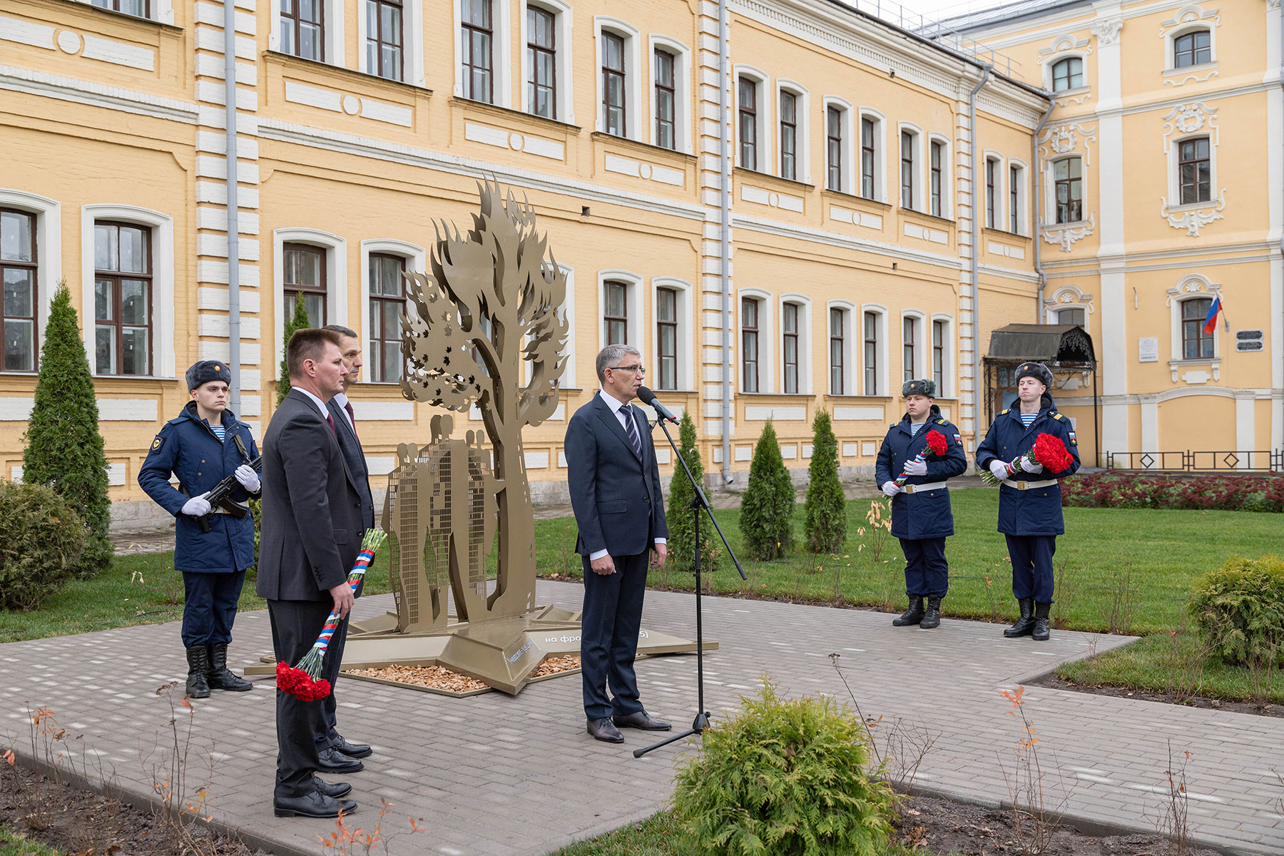 Особенность мемориала — клены, посаженные студентами и преподавателями перед уходом на фронт. Губернатор возложил цветы к памятнику вместе со внуком одного из студентов-фронтовиков Сергеем Данилиным.