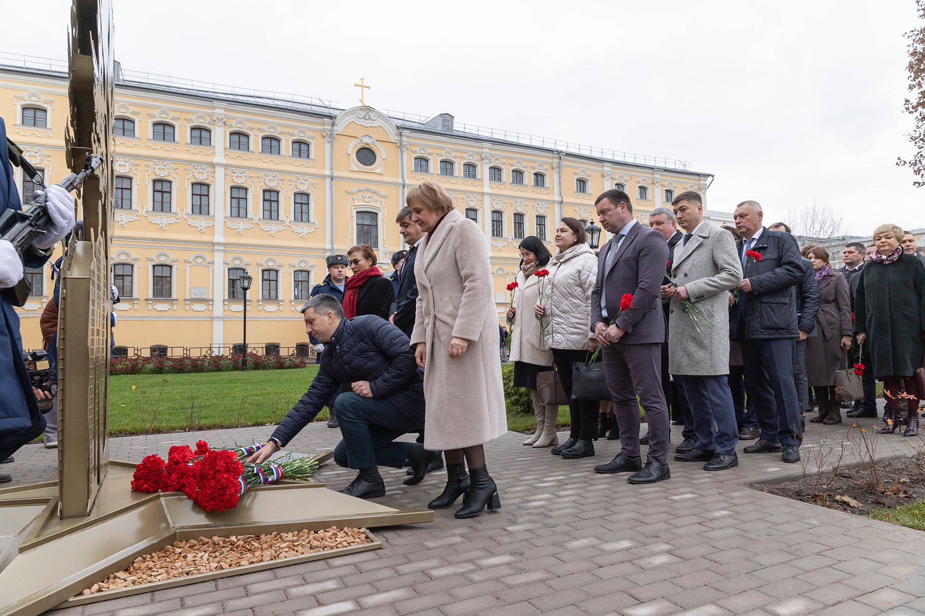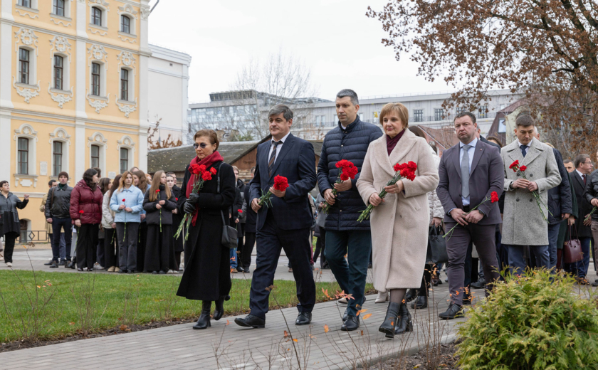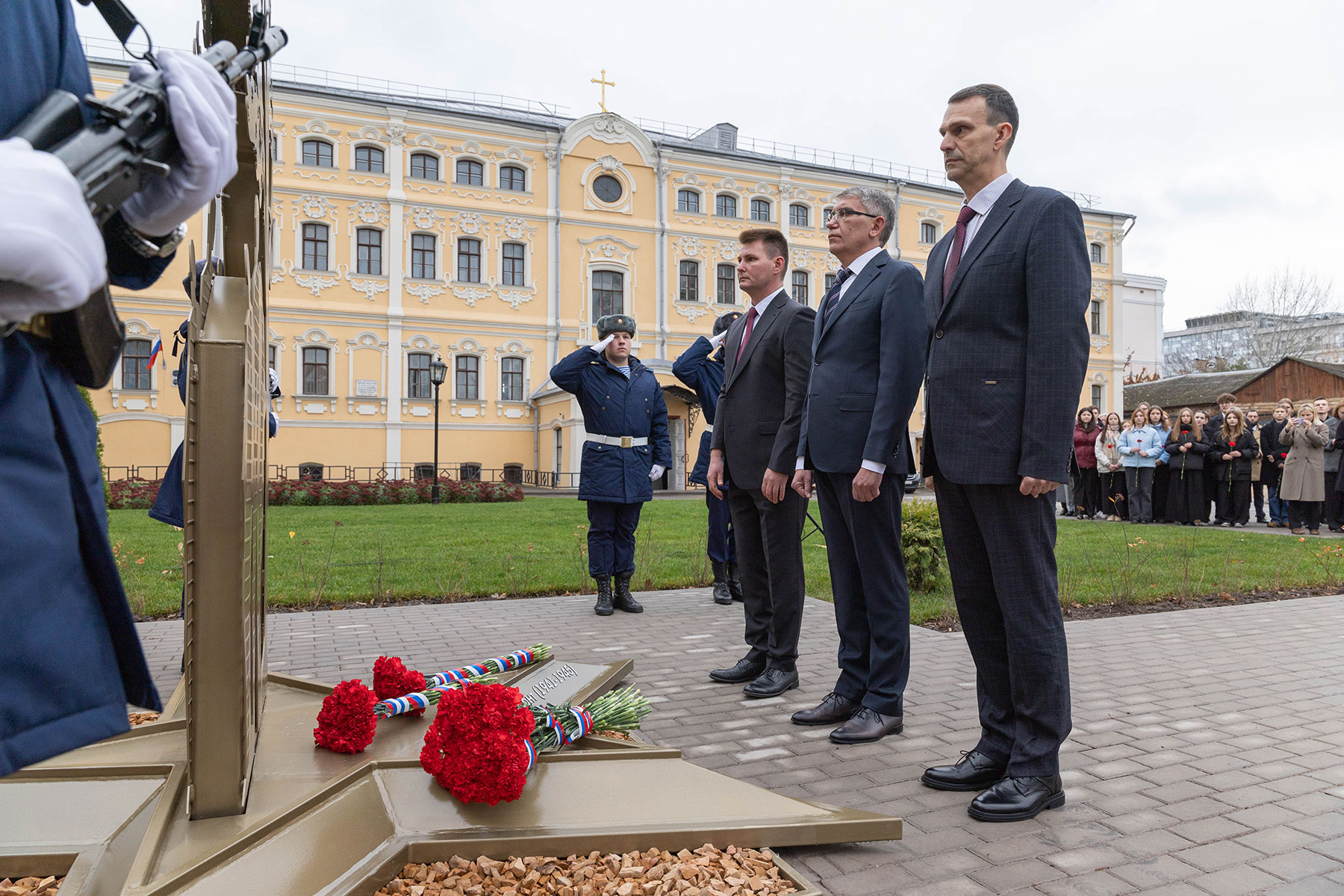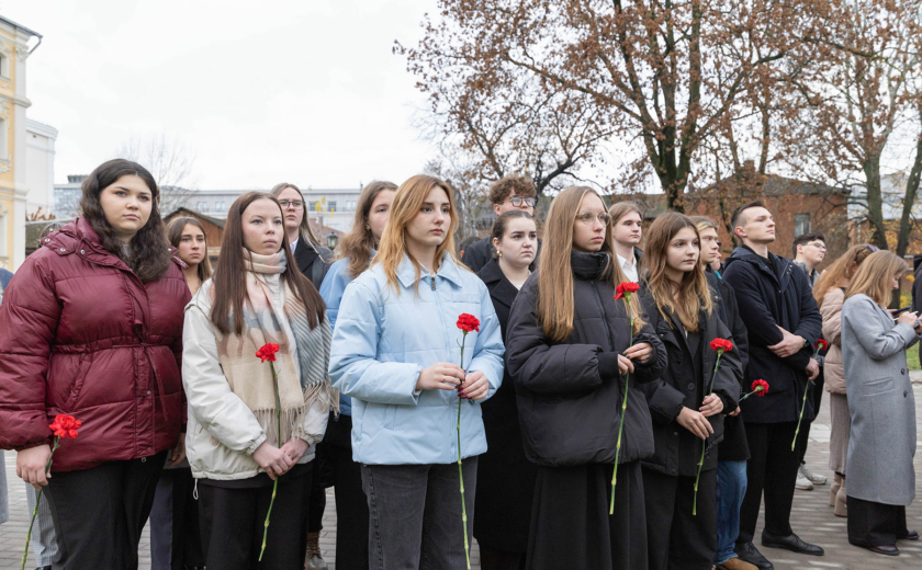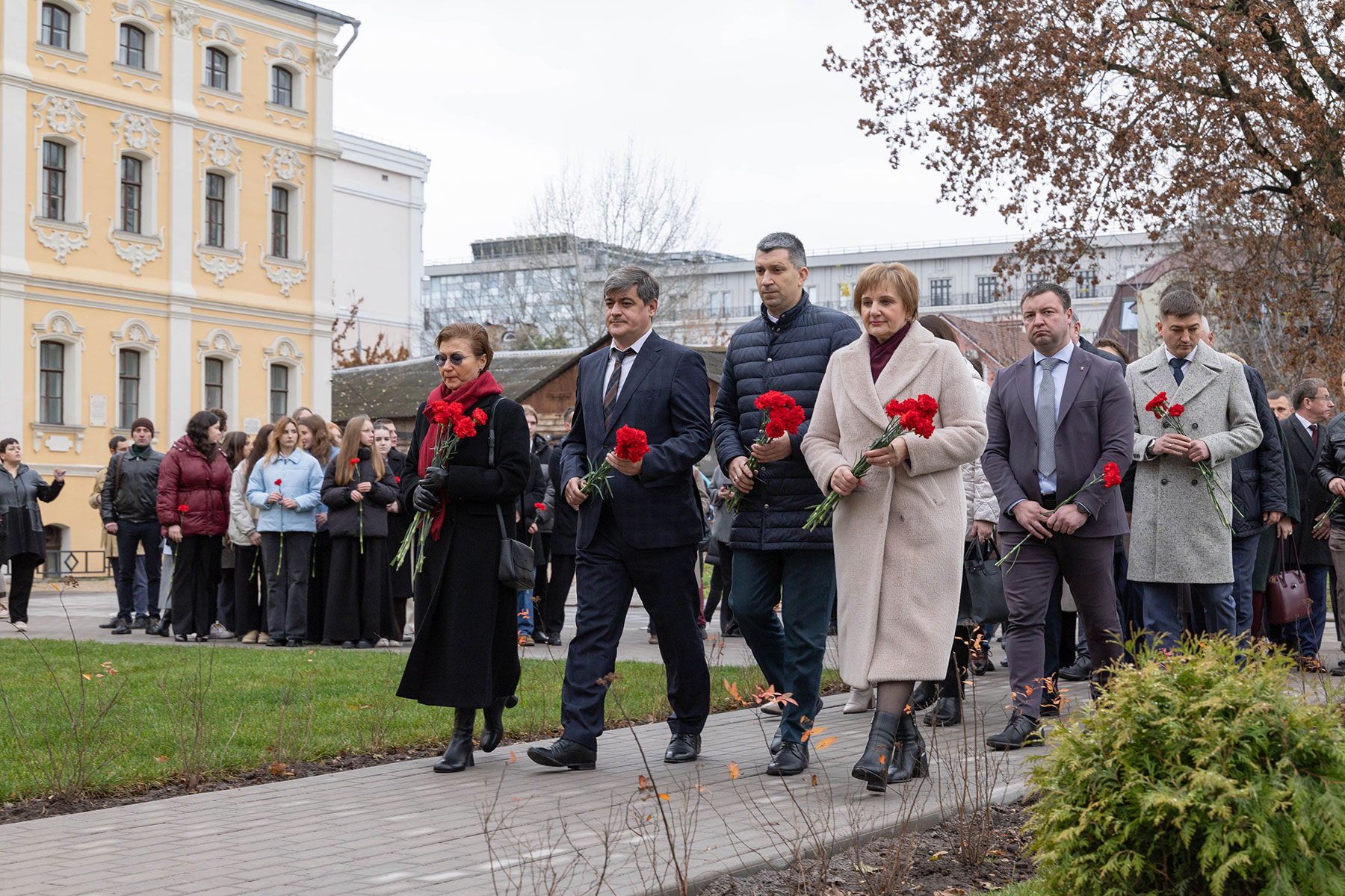 Особенность мемориала — клены, посаженные студентами и преподавателями перед уходом на фронт. Губернатор возложил цветы к памятнику вместе со внуком одного из студентов-фронтовиков Сергеем Данилиным.