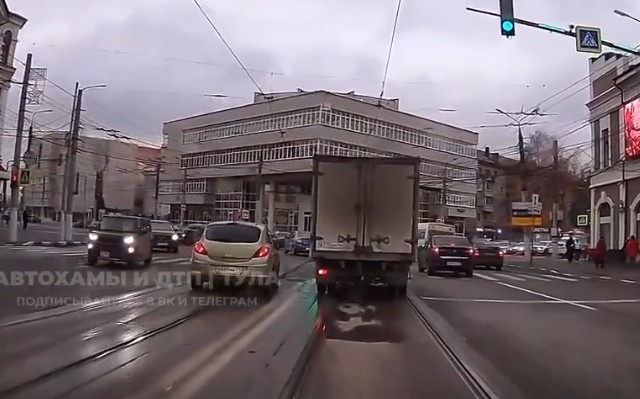 В Туле по соцсетям разошлось видео опасного обгона: водитель золотистого опеля на улице Советской, в направлении к улице Оборонной, выехал на встречную полосу по трамвайным путям, чтобы обойти фуру.