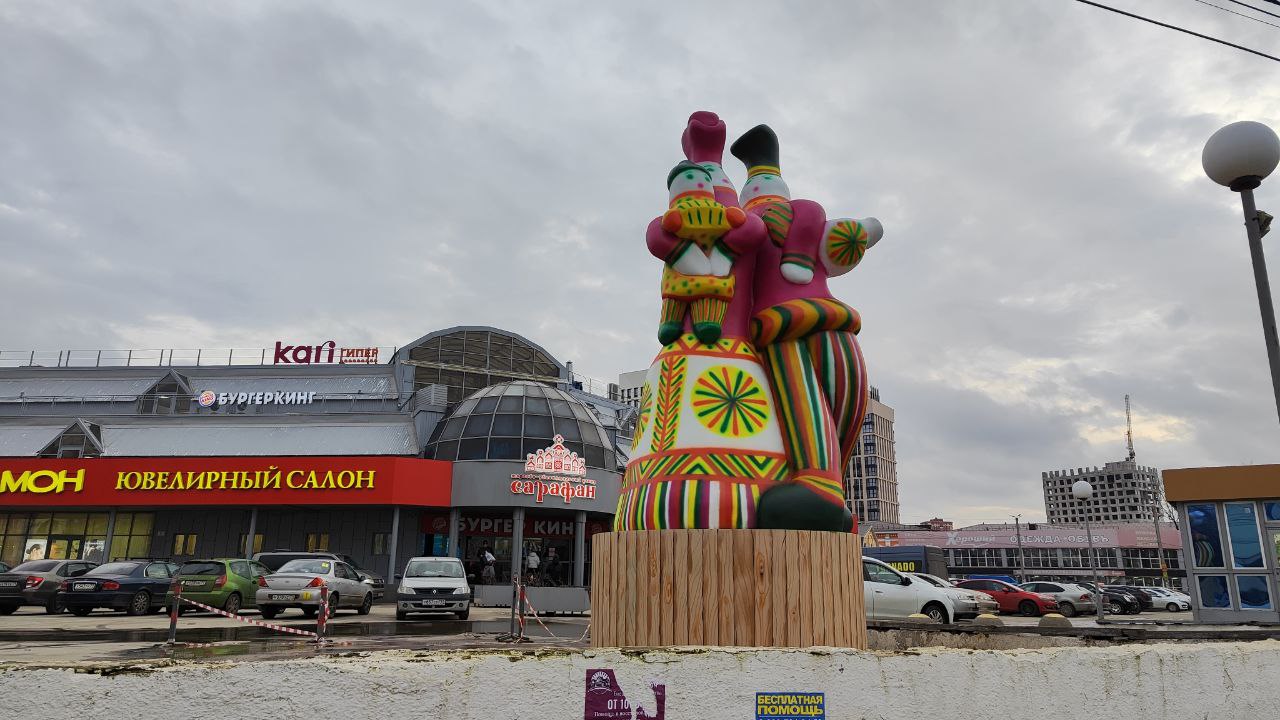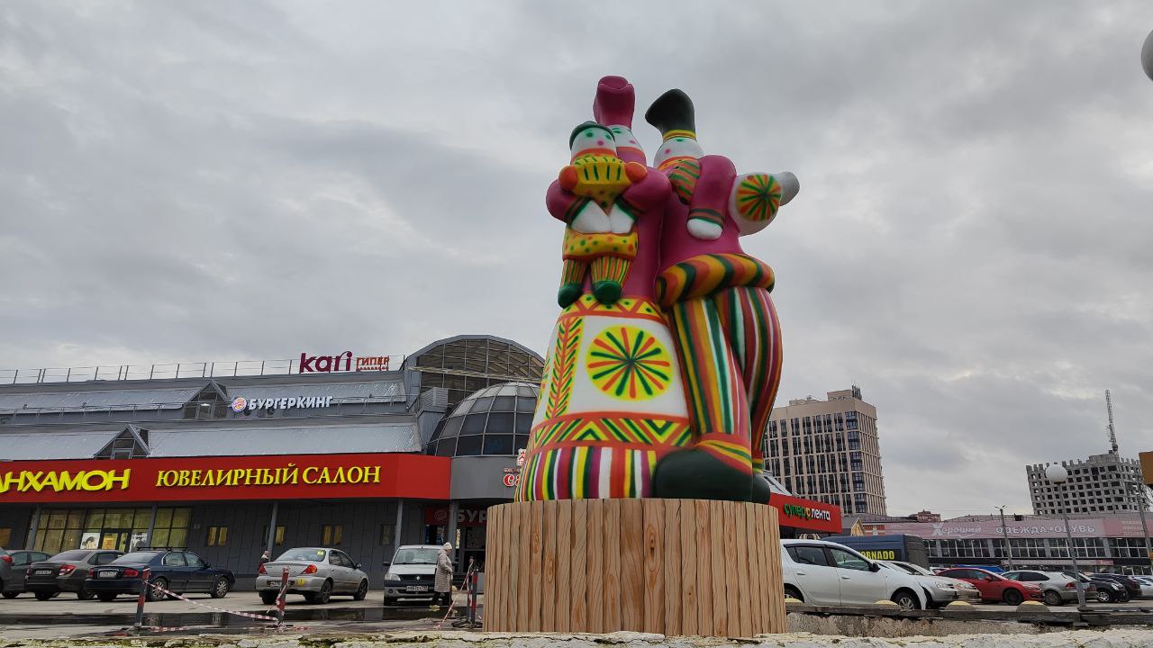 В Туле на площади Московского вокзала появилась огромная филимоновская игрушка. Высота арт-объекта составляет пять метров. Он представляет собой семейную пару, женщина держит на руках маленького ребенка.