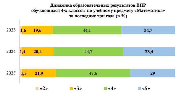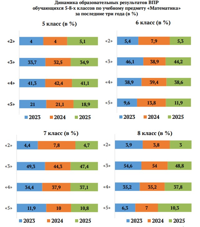 И вот закономерность: в средней школе оценки по ВПР значительно хуже, чем в начальной или в старшей. В каждом классе — от пятого до восьмого — почти 5% (где-то больше, где-то меньше) обучающихся написали работы на двойки. Большинство получили тройки, остальные разделили между собой четверки и пятерки. Но задания в старших классах сложнее: трудности у ребят вызывал повышенный уровень — задачи в несколько действий и геометрические задачи.
