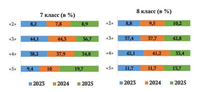 Так, в пятом классе 9,2% оценок — это двойки (тенденция на рост «неудов» также сохраняется), пятерок — 18,2%. В шестом, седьмом и восьмом классах соответственно: