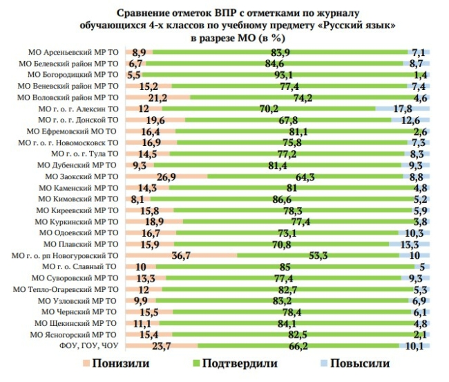 В разрезе по районам Тульской области хуже всего дела с ВПР [по русскому языку в четвертом классе] обстоят в Новогуровском поселке, где свои знания не подтвердили 36,7% детей, в Заокском районе — 26,9%, а также в Воловском — 21,2%. Тех, кто свои знания не просто подтвердил, а еще и повысил, больше всего в Алексине — 17,8%, Плавском районе — 13,3%, Донском — 12,6%.
