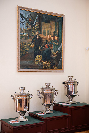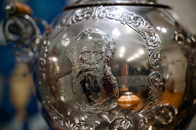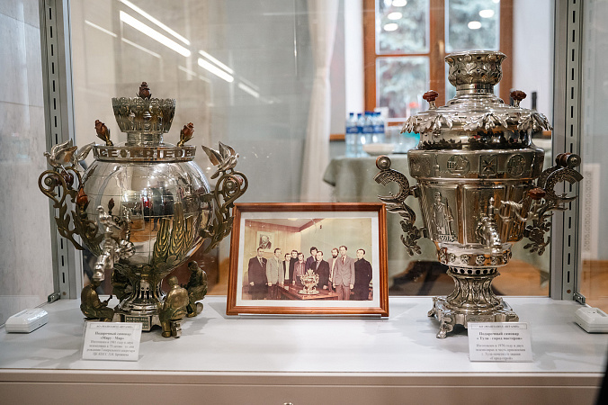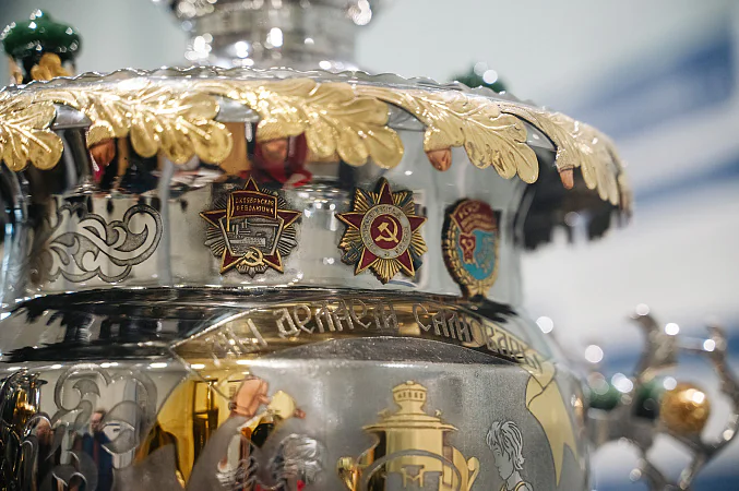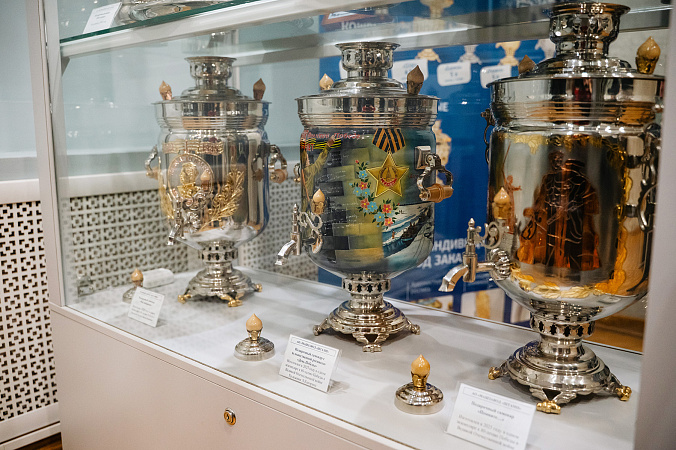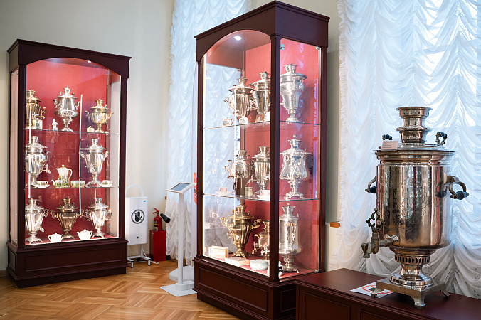 В экспозиции — 19 уникальных подарочных самоваров и наборов из собрания заводского музея «Штамп». Среди раритетов — «Дружба народов», преподнесенный Леониду Брежневу, и «Русское поле», которое в итоге стало подарком Елизавете II. Есть и «кинозвезды» дипломатии: набор «Россия», врученный Гельмуту Колю, а еще редкие формы, роспись, чеканка и гравировка — все вручную.