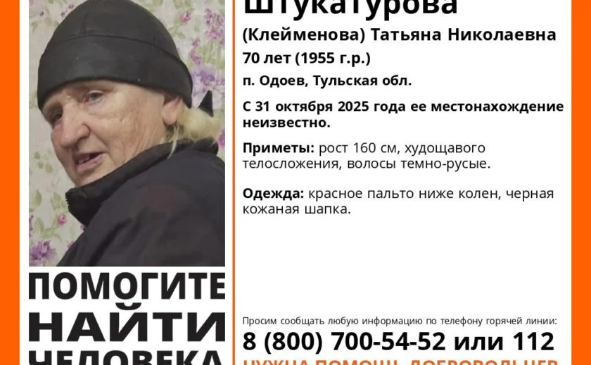 В Одоеве ищут 70-летнюю Татьяну Штукатурову (Клейменову). Местонахождение пенсионерки неизвестно с 31 октября 2025 года. Об этом рассказали в региональном отделении поисково-спасательного отряда «ЛизаАлерт».