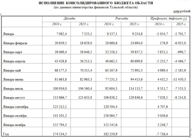 По итогам девяти из двенадцати месяцев 2024-го региональный консолидированный бюджет был исполнен с профицитом. В целом же за год тульский минфин зафиксировал дефицит в размере 7 716,4 млн рублей. В текущем году ситуация сложилась иначе — каждый месяц был дефицитным. Данные таковы: бюджет Тульской области с января по август 2025 года был исполнен с дефицитом 8 214,8 млн рублей (что уже больше, чем за весь прошлый год).