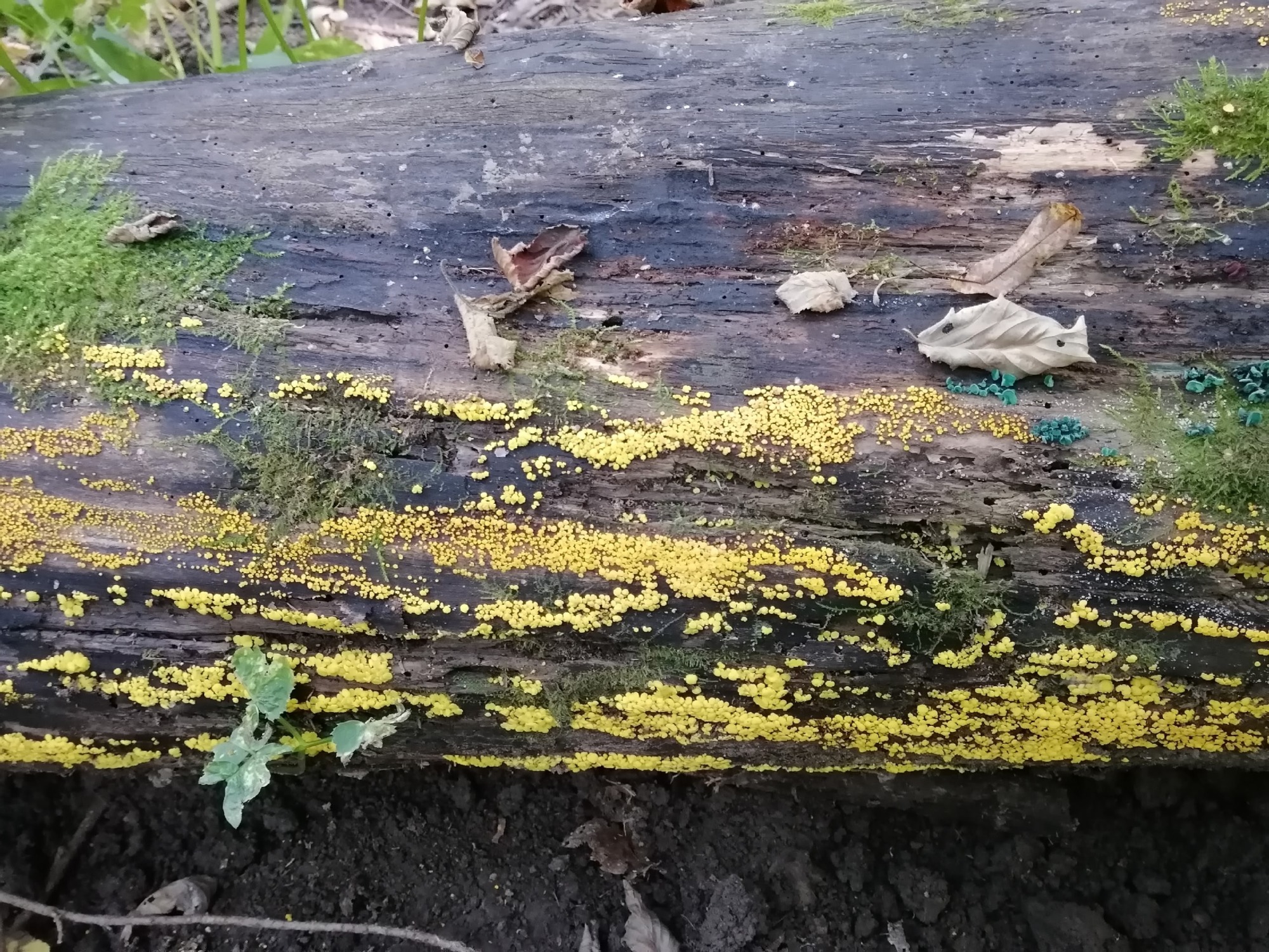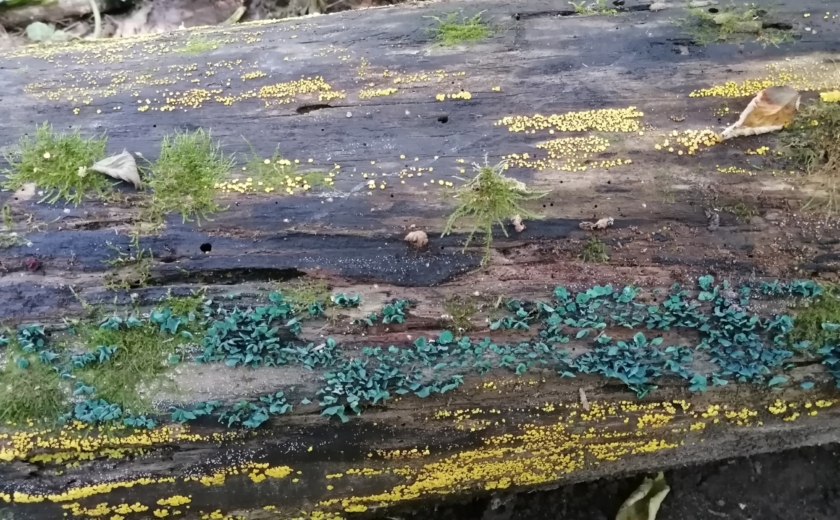 На фото рядом с хлороцибориями также хорошо видны маленькие грибы желтого цвета. Это биспорелла лимонная — несъедобный гриб. Растет он летом и осенью в лиственных и смешанных лесах и также на гниющей древесине.