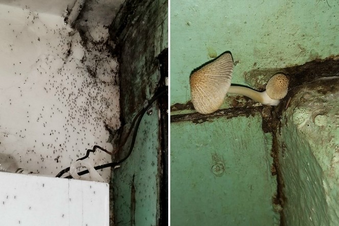 Ситуация осложнилась после недавнего прорыва канализации в подвале — теперь к сырости и насекомым добавился резкий неприятный запах, а на стенах проросли настоящие грибы.