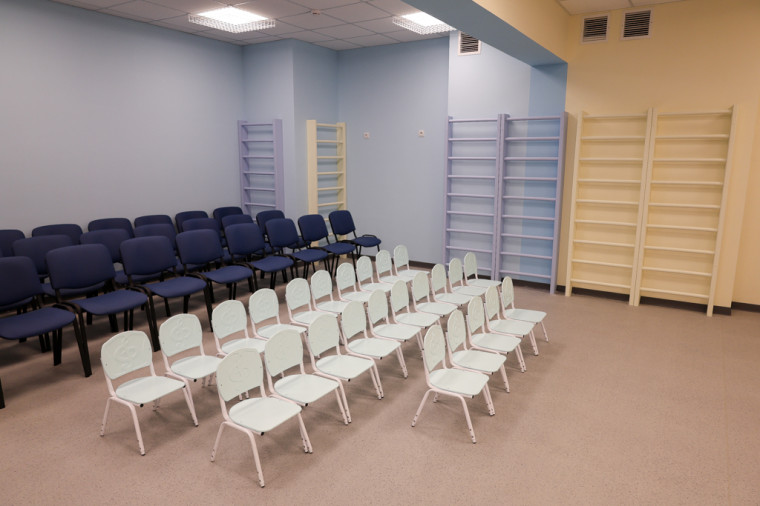 Помимо групповых в детском саду предусмотрен пищеблок, медблок, состоящий из медицинского и процедурного кабинетов, универсальный зал для проведения занятий по физкультуре и занятий по музыке, кружковое помещение, рекреация. В каждой групповой есть телевизор. В универсальном зале – электрическое пианино. Есть система видеонаблюдения. Внутри и снаружи здания установлена 21 камера. Кроме того, здание оборудовано лифтом.