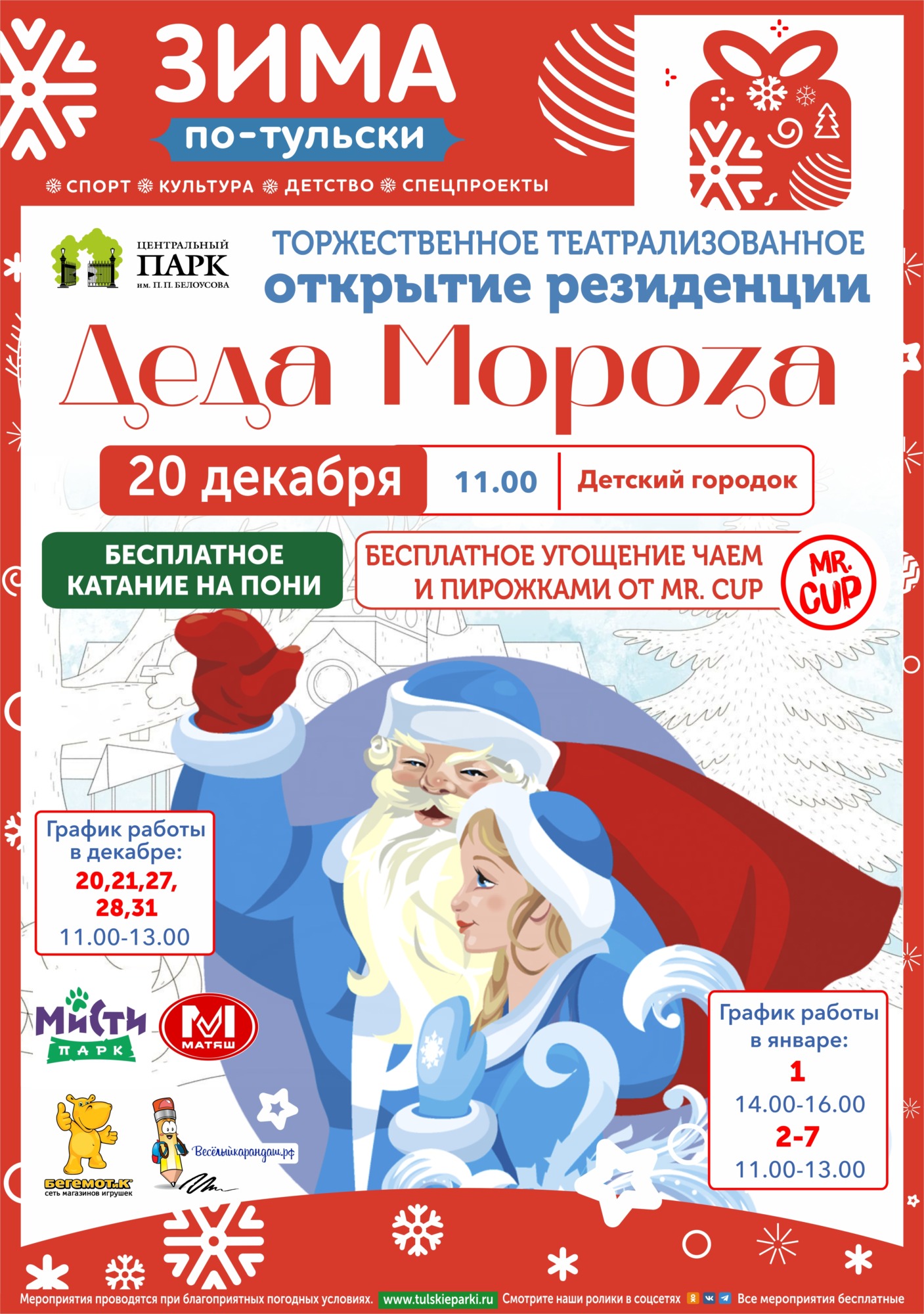 А уже 20 декабря состоится торжественное открытие резиденции Деда Мороза в Центральном парке. В программу мероприятия вошли анимационные игры, подарки и встреча с Дедом Морозом и Снегурочкой.