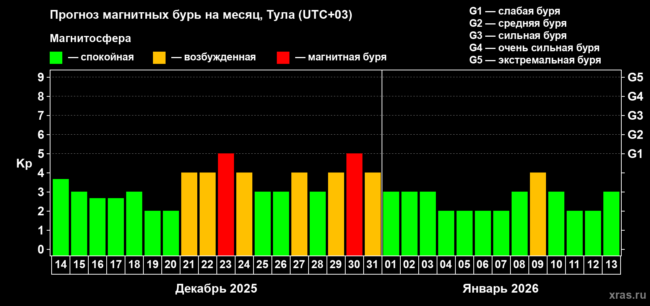 По прогнозу лаборатории солнечной астрономии Института космических исследований РАН, три дня подряд будет возбужденная магнитосфера. Во вторник, 30-го числа, буря достигнет отметки G1.