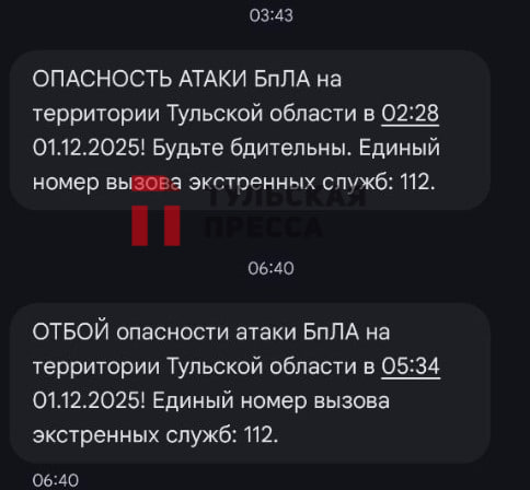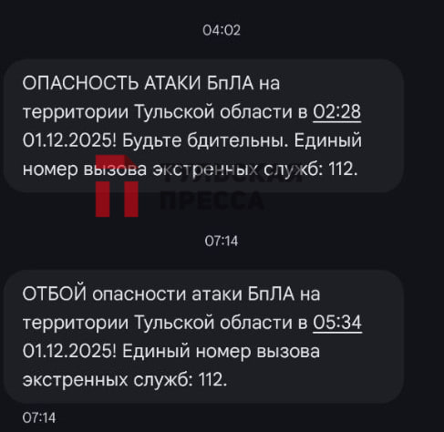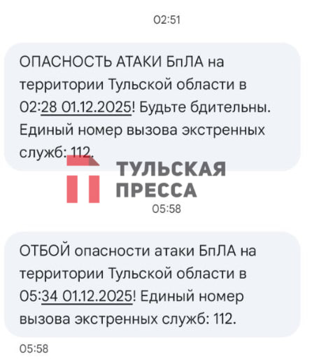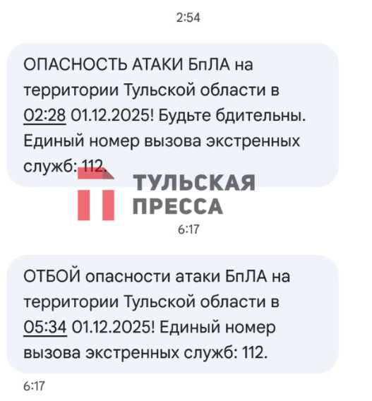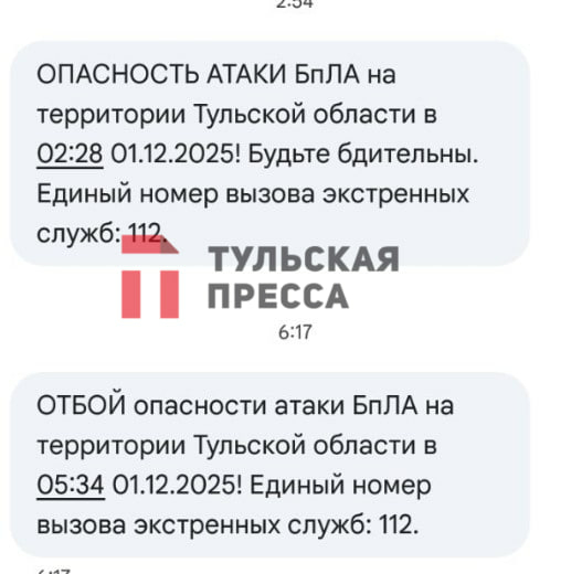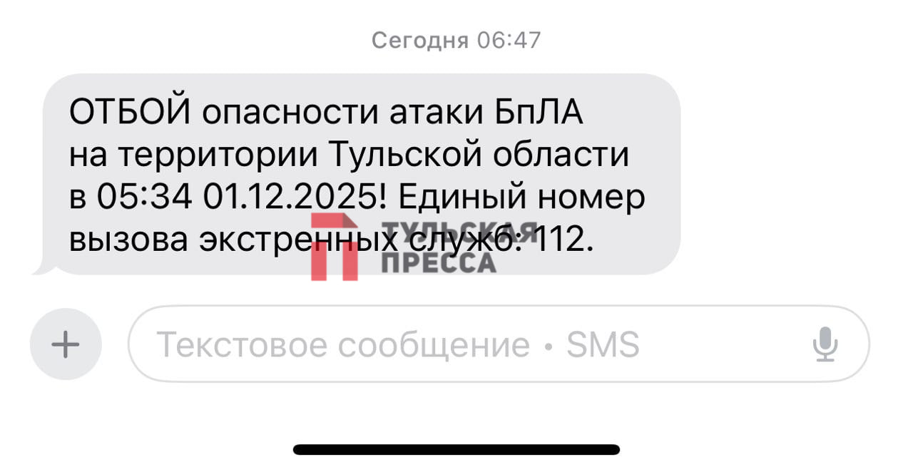 Мобильные операторы начали присылать тулякам сообщения об отмене атаки БПЛА. Правда, с часовым опозданием. Угрозу опасности отменили, согласно сообщениям, в 05:34, а сами СМС пришли уже ближе к семи утра.
