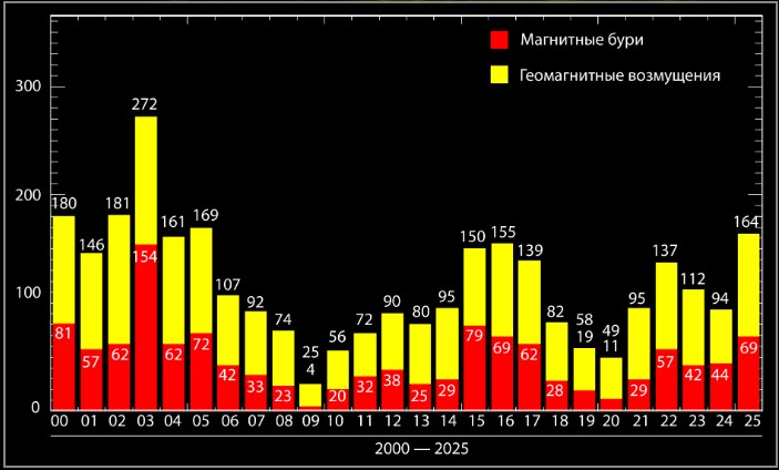 Так, за прошедшие 358 дней магнитные бури наблюдались в 69 случаях против 44 в 2024 году. На 75% выросло количество дней с геомагнитными возмущениями за год — с 94 до 164. Отмечается, что последний раз аналогичное количество дней с магнитными бурями было в 2016 году, еще больше — в 2015-м (79).
