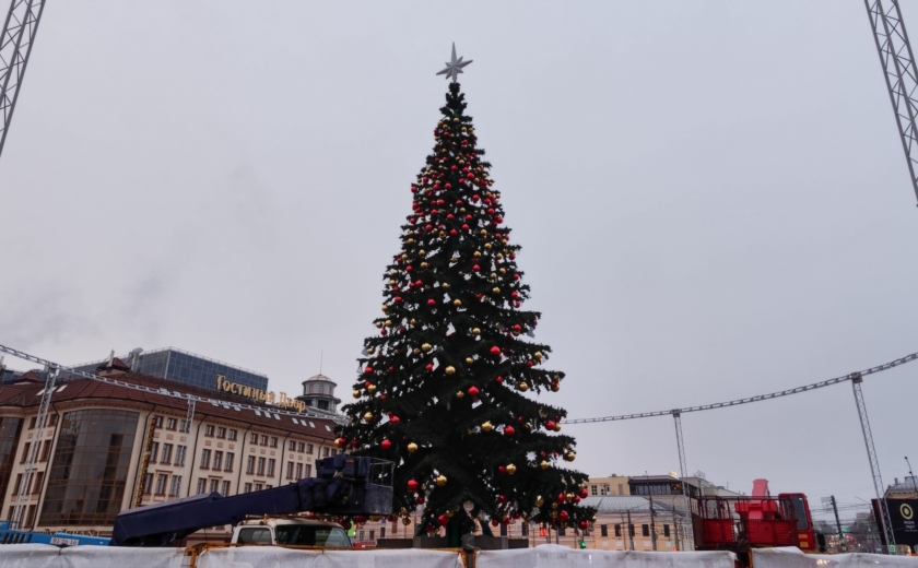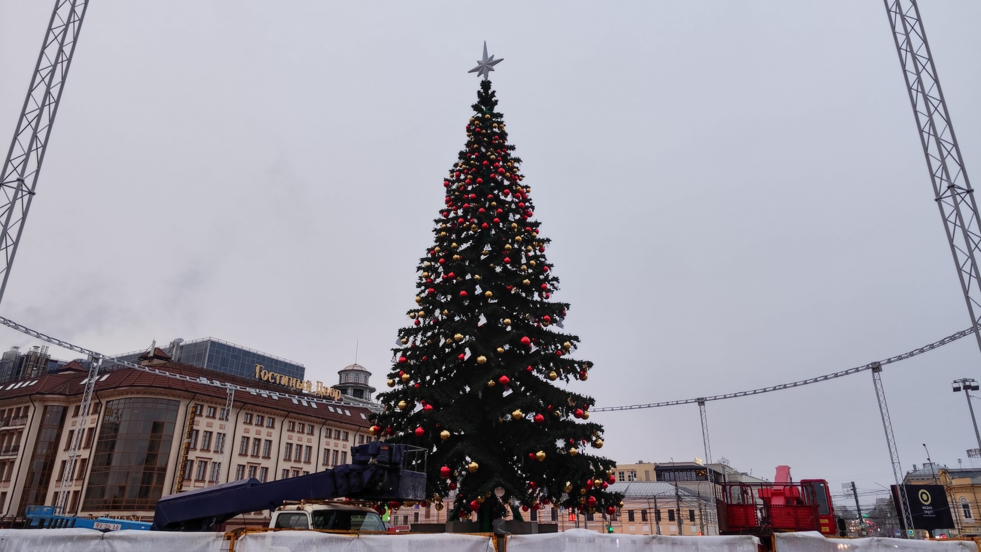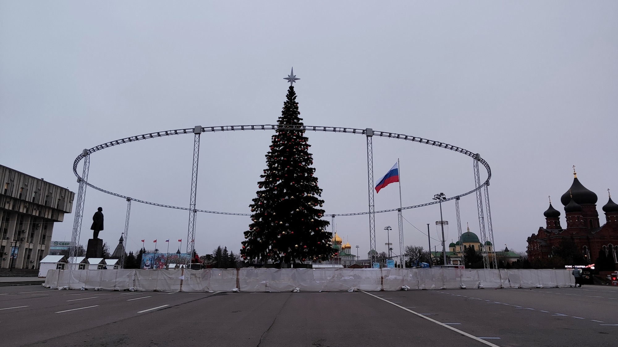 На площади Ленина в Туле завершили установку новогодней елки. Теперь рабочим остается только смонтировать шатер с управляемой гирляндой и поставить вокруг небольшие ели.