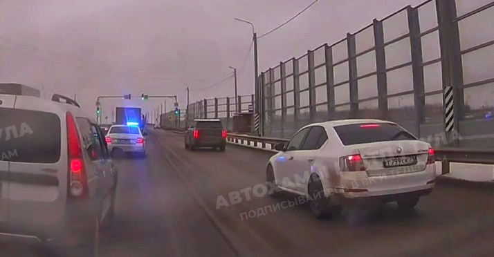 Очевидец записал на видеорегистратор момент, как два туляка на GAC и Škoda Octavia едут по правой полосе, которая предназначена только для поворота в онкологический центр. Они пытались побыстрее проскочить пробку, но не заметили главного: в ней двигались сотрудники ДПС.