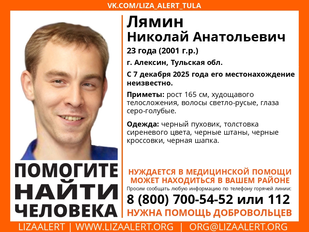 В Тульской области уже несколько дней разыскивают мужчину, нуждающегося в медпомощи. Как сообщает поисковый отряд «ЛизаАлерт», местонахождение 23-летнего Николая Лямина из Алексина неизвестно с 7 декабря.