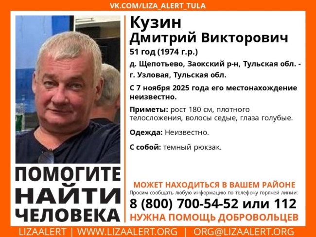 Поисковый отряд «ЛизаАлерт» разыскивает 51-летнего Дмитрия Викторовича Кузина из Узловой. Мужчина пропал почти месяц назад — 7 ноября, и до сих пор его местонахождение неизвестно.