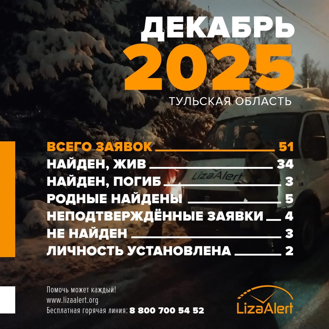 Поисковый отряд «ЛизаАлерт» в Тульской области представил статистику за декабрь 2025 года. Всего активистам поступила 51 заявка. 34 человека удалось найти живыми. Трое, к сожалению, погибли.
