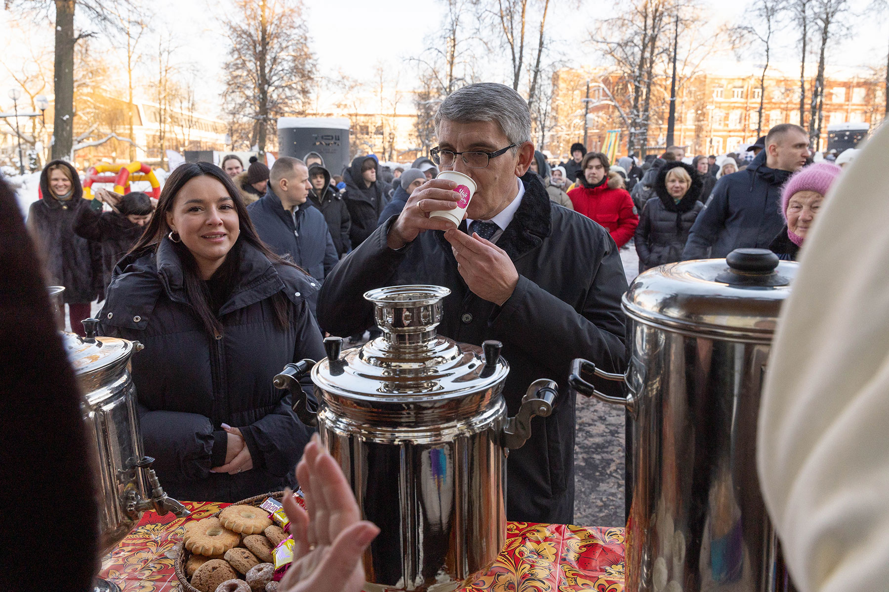 Губернатор также встретился со студентами на территории уличного сквера «Точка» рядом с Тульским областным центром молодежи. Сегодня здесь работали площадки Молодежного совета правительства Тульской области, Международного клуба дружбы. Ребята играли в «снежный боулинг», «футбол в валенках», участвовали в мастер-классах, водили хоровод. А еще — вместе с Дмитрием Миляевым пробовали «чай на удачу» из тульского самовара.