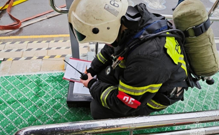Огнеборцы отработали действия в условиях задымления: звенья газодымозащитной службы обследовали помещения, нашли «пострадавшего» и эвакуировали его по лестнице с использованием спасательного устройства.
