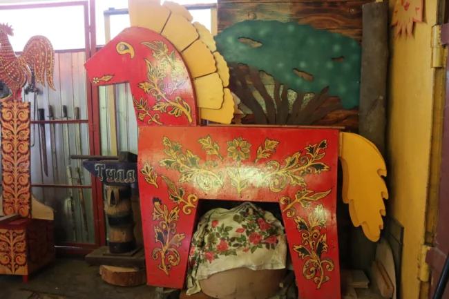 Внутри дома у Александра стоит деревянная лошади: в 2004 году у главпочтампа она была арт-объектом. За 10 и более лет, что фигуры украшают его дом под открытым небом, они не испортились.