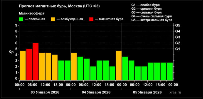 Днем магнитная буря пойдет на спад, а к вечеру обстановка и вовсе стабилизируется. Специалисты также предупреждают о небольших геомагнитных возмущениях утром и вечером 4 января.
