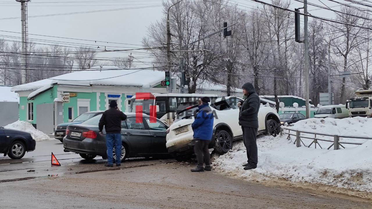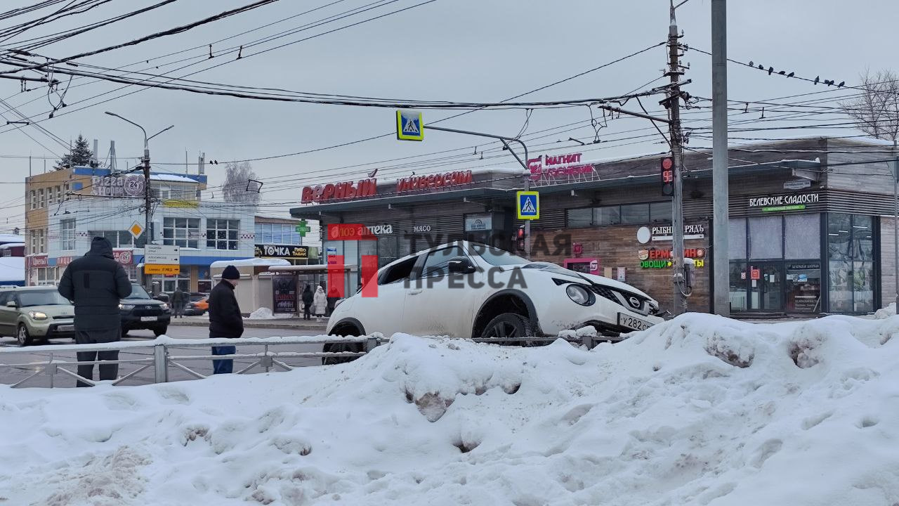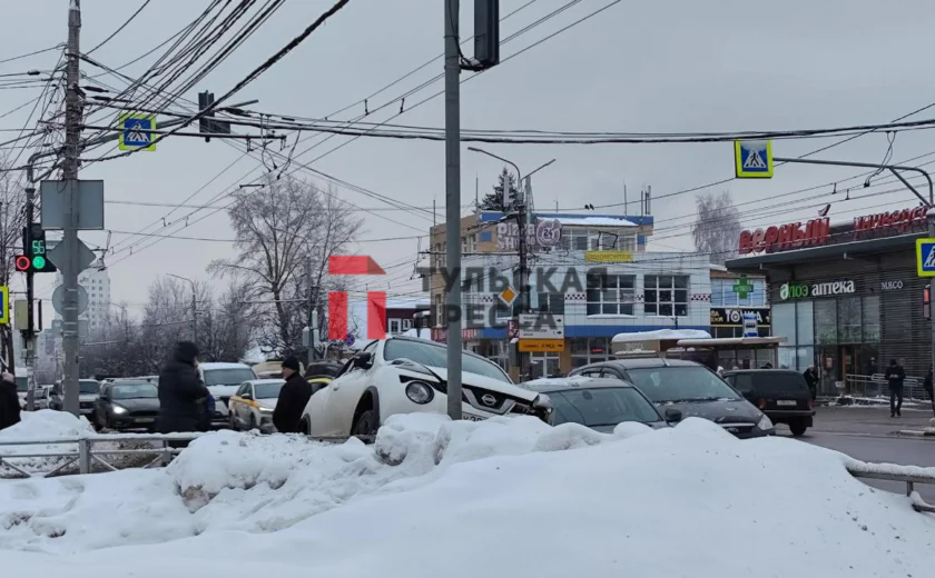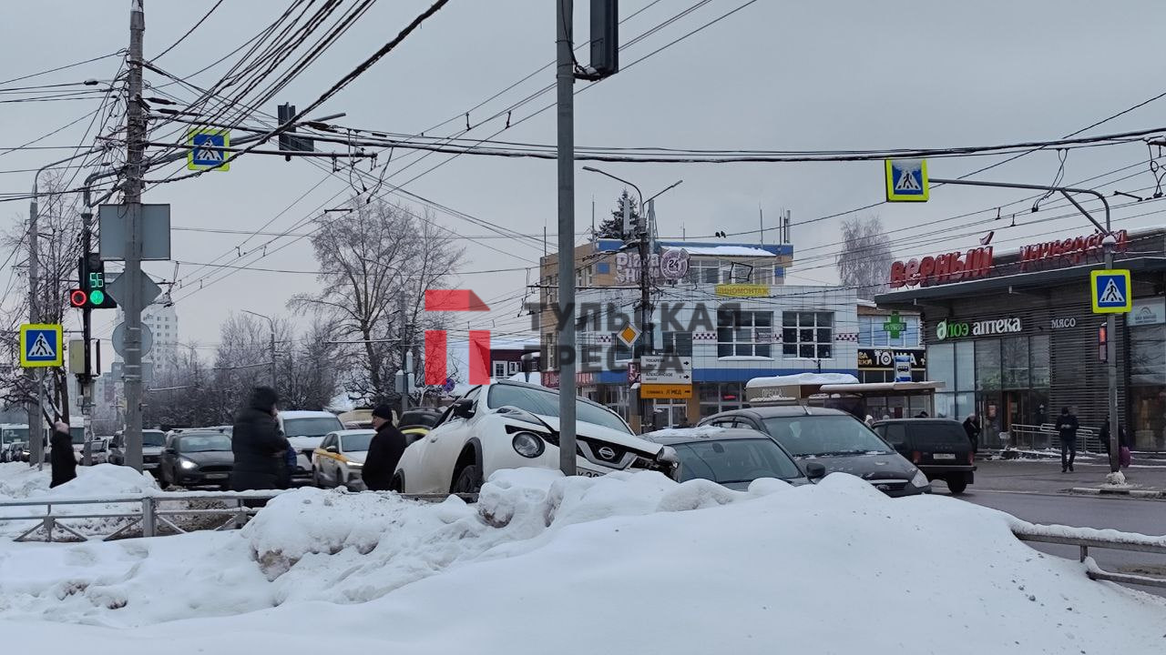 В Туле на пересечении Октябрьской улицы и улицы Токарева произошла серьезная авария: напротив Центра образования № 5 столкнулись BMW и Nissan. Последний, как видно на кадрах, от удара вылетел на сугроб и сильно повредил переднюю часть.
