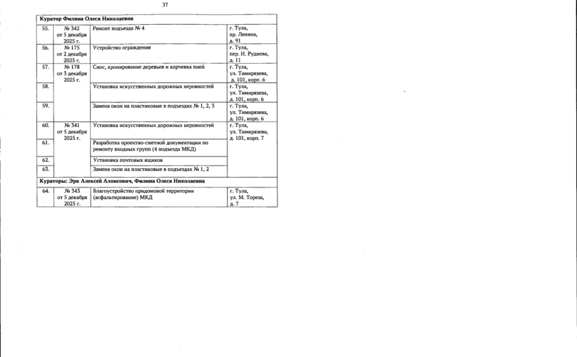 Тульская городская Дума утвердила план мероприятий по реализации проекта «Наш город» в 2026 году. Депутаты одобрили свыше 60 заявок от жителей по благоустройству придомовых территорий, ремонту подъездов, обустройству тротуаров и парковочных пространств, кронированию деревьев и т.д.