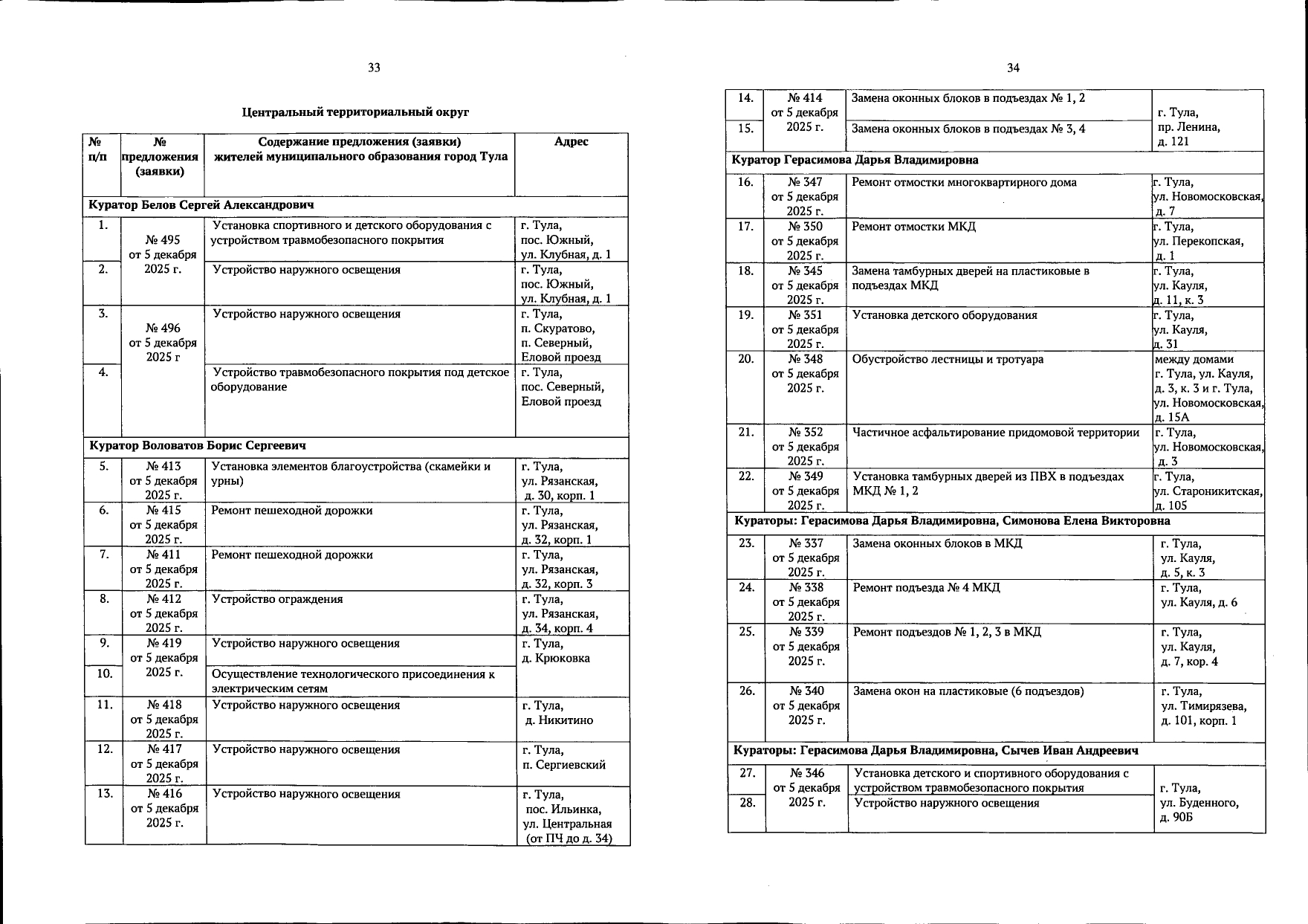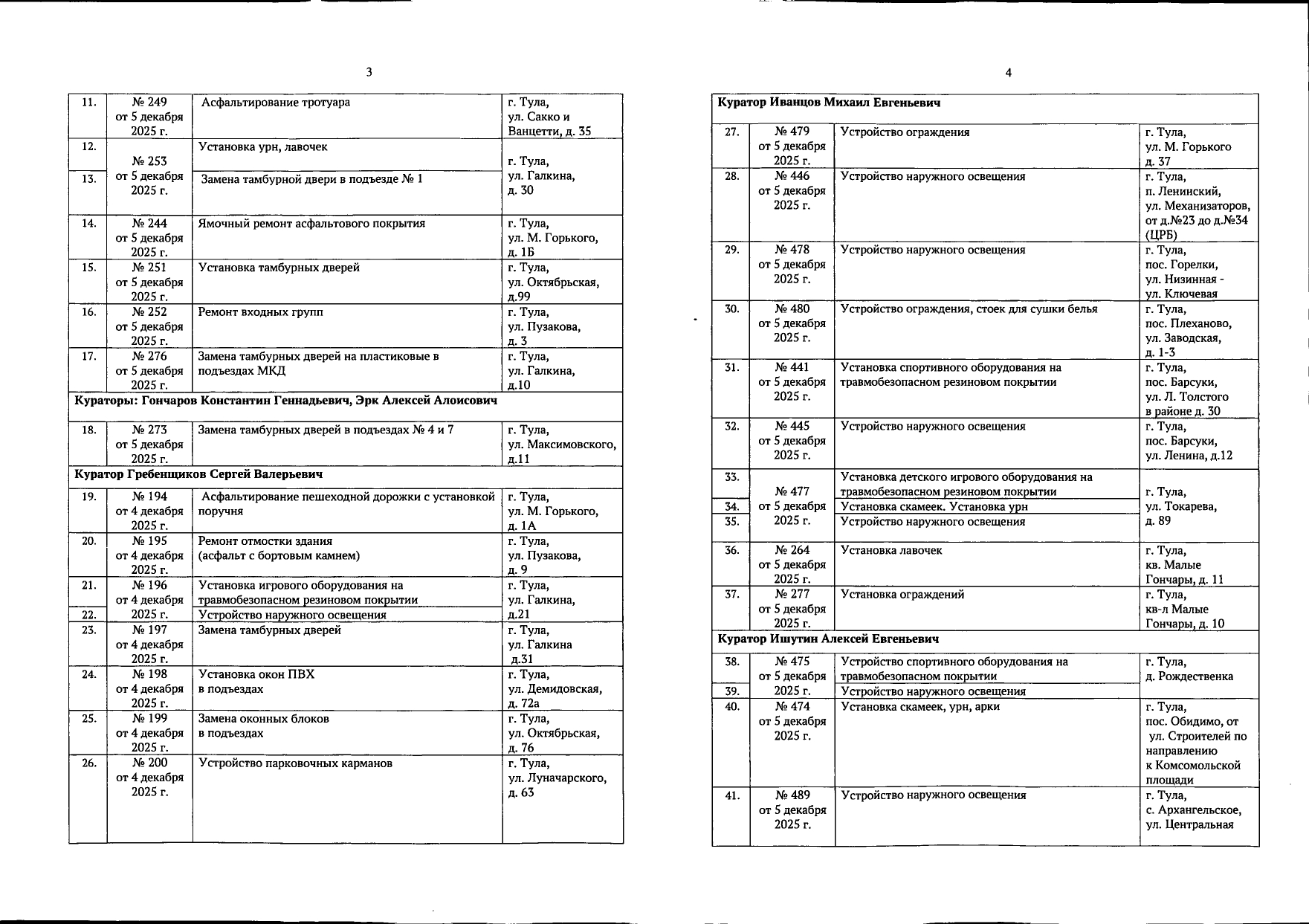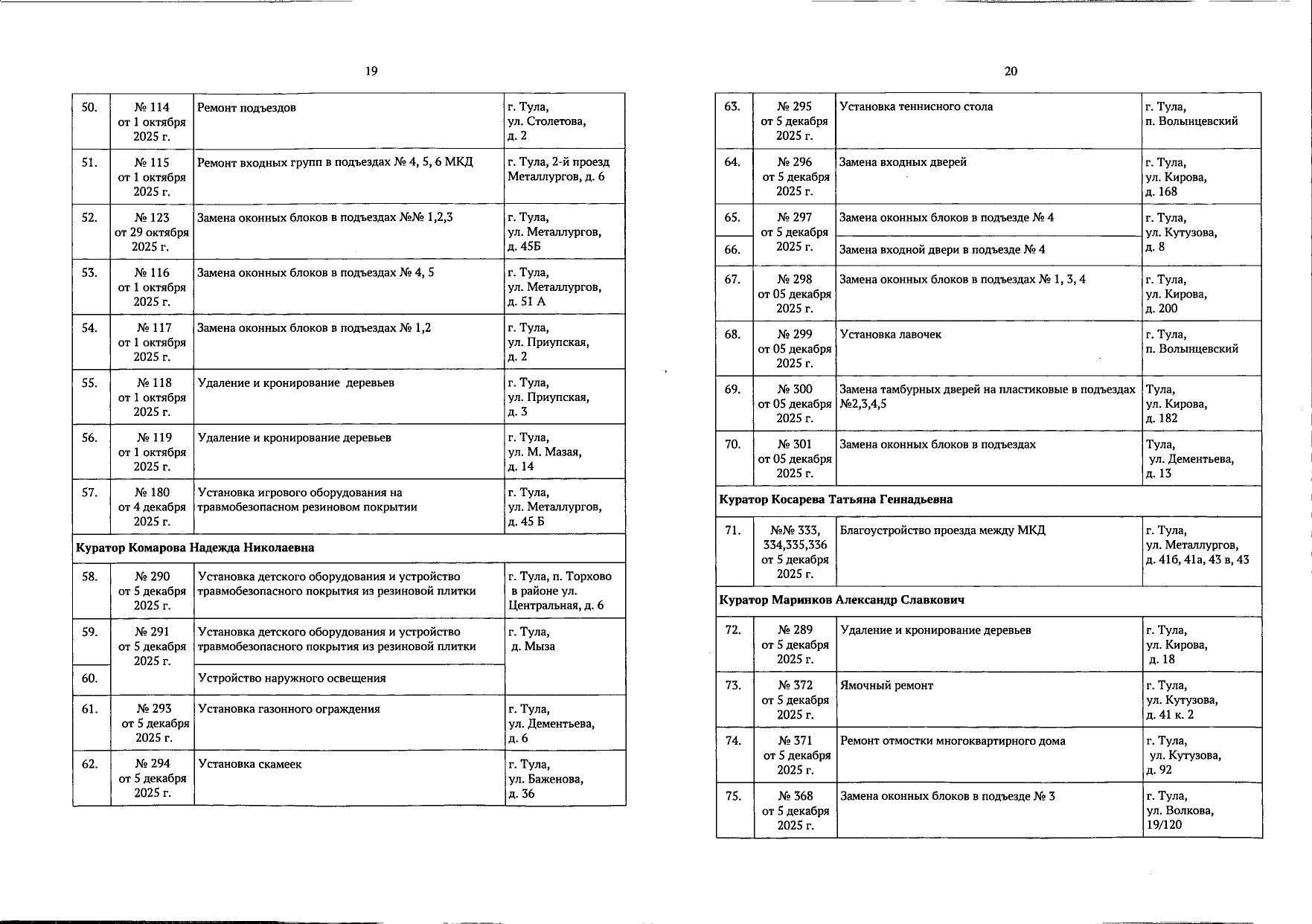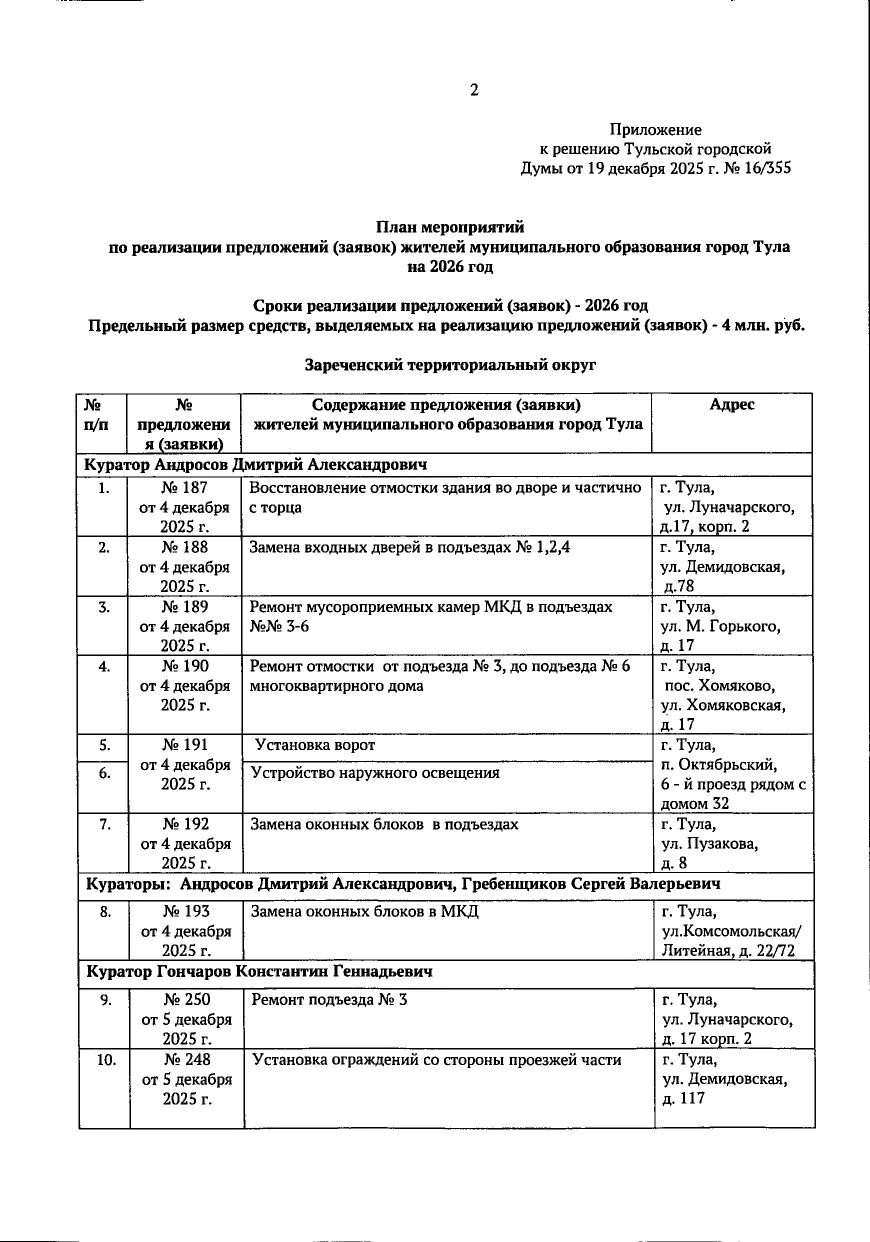 В галерее — список одобренных заявок, адреса и кураторы из числа депутатов городской Думы.