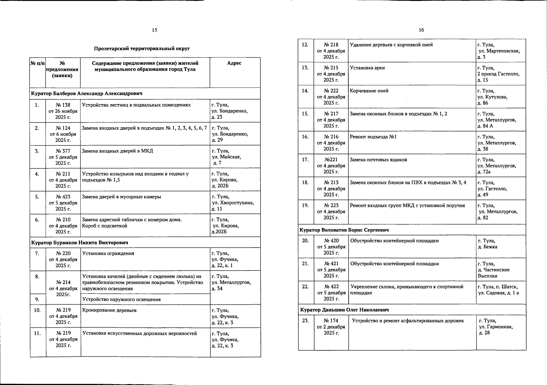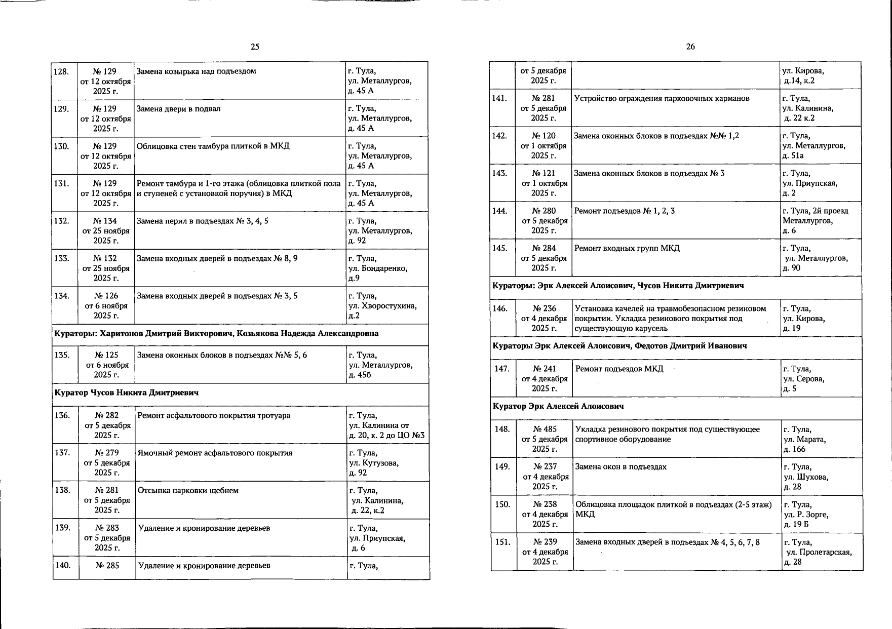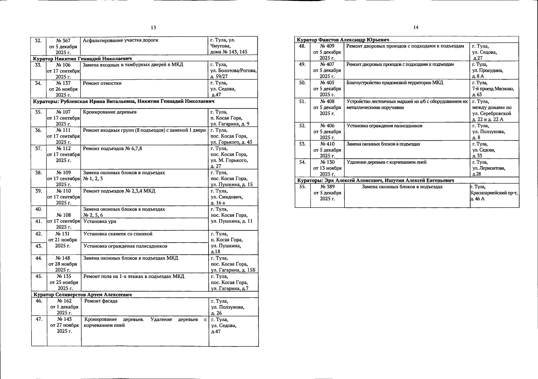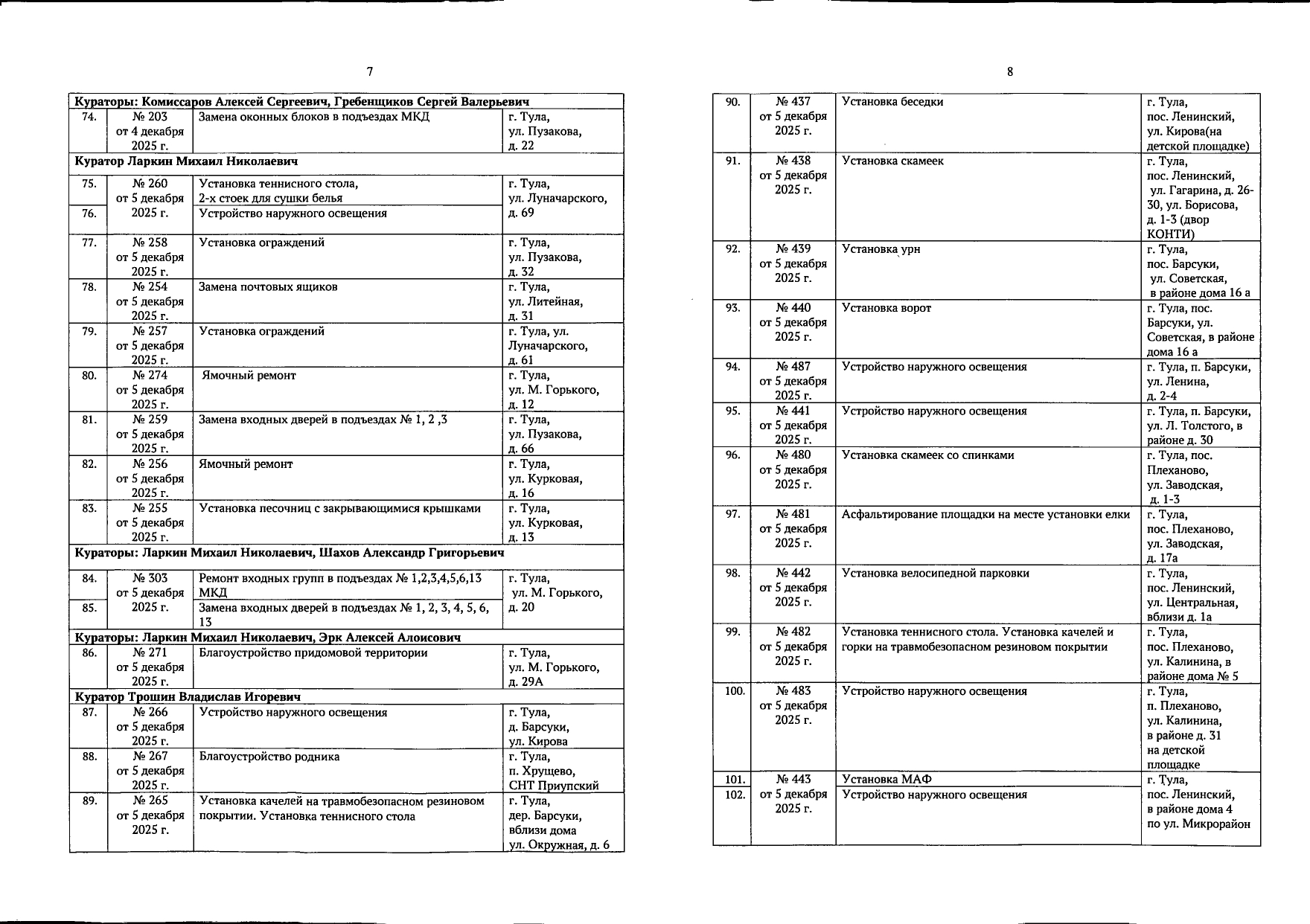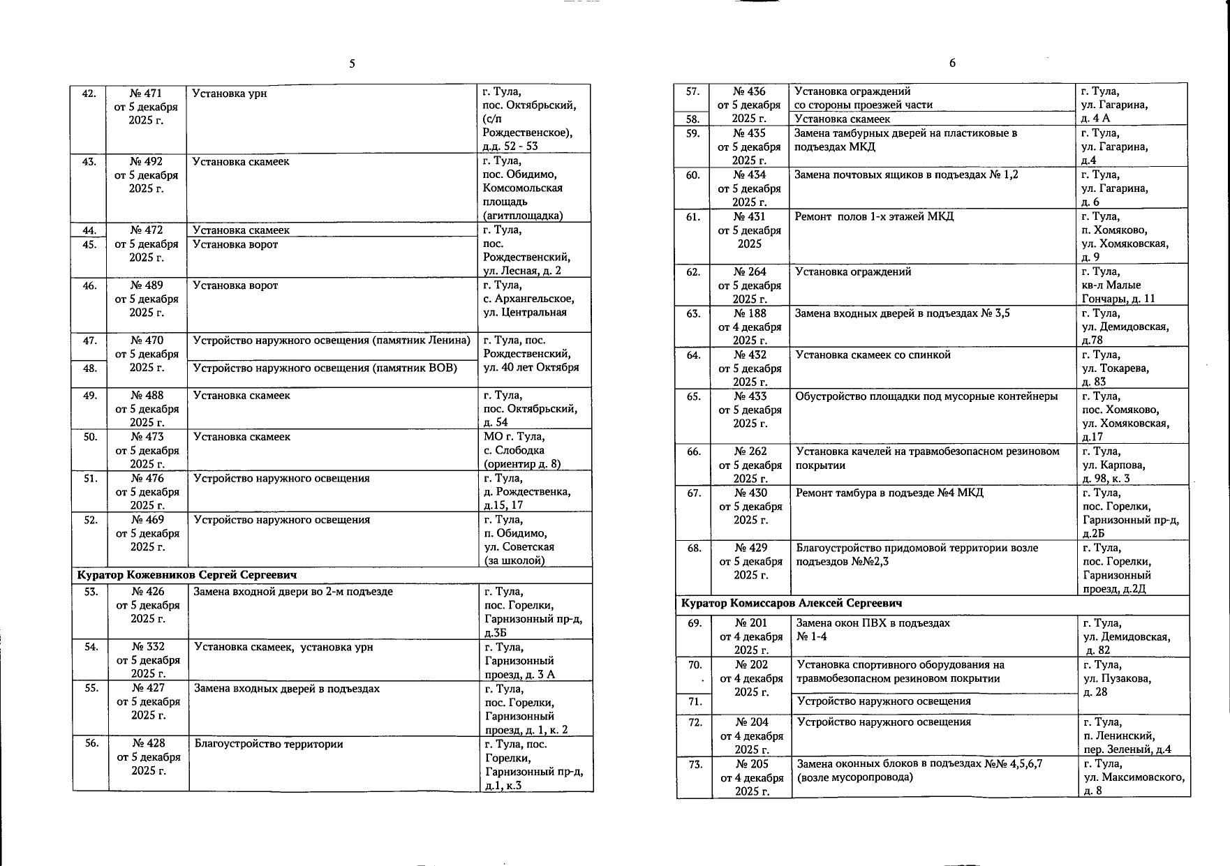 В галерее — список одобренных заявок, адреса и кураторы из числа депутатов городской Думы.
