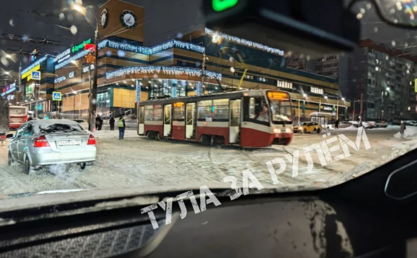 В Туле возле торгового центра «Рио» трамвай сошел с рельсов. По словам очевидцев, вагон развернуло почти на 90 градусов.